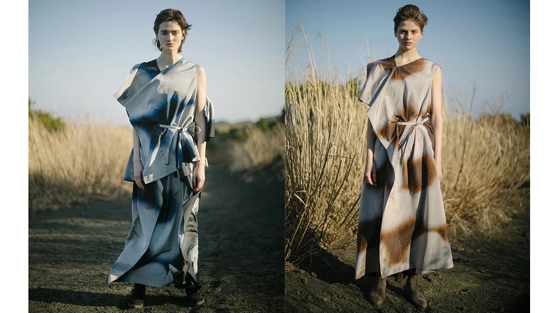 顧名思義整體是受到自然界中石材的啟發,再由京都工匠使用「suminagashi」的傳統技藝製作。將染料滴在水面上,經自由擴散創造出圖案,再吸收、轉移到乾淨的織物上,無論是襯衫或洋裝款式,都懸掛於身上創造出柔軟輪廓,呈現精緻美感的別緻圖案。