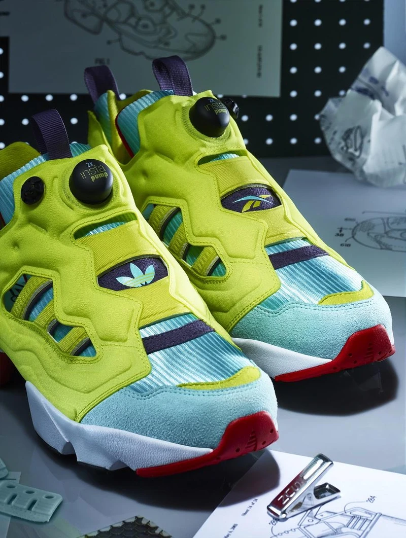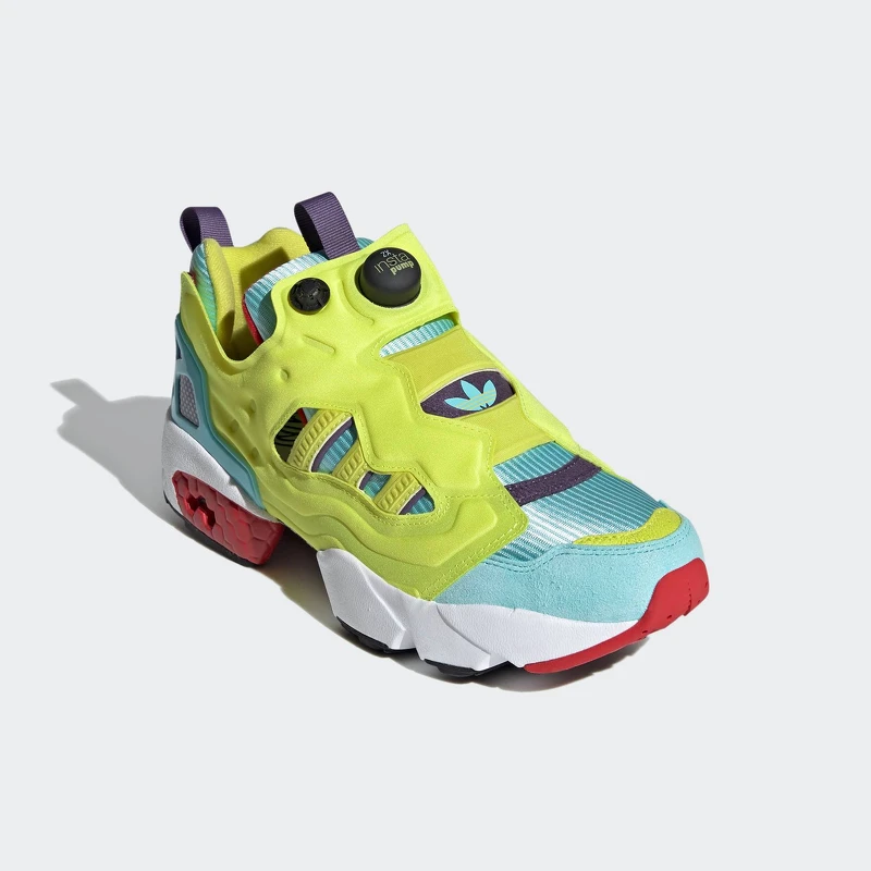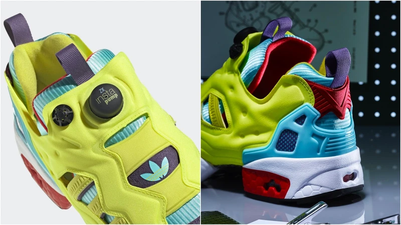 全新ZX Fury 保留 Reebok 結構性的拼接設計,在鞋子的配色上擷取兩款球鞋過去推出過的顏色做混搭——Instapump Fury鮮豔的螢光黃與紅、adidas ZX8000的湖水藍,加上紫色拼湊在一起。鞋子的側邊可以看到Instapump Fury標誌性的蜂窩巢鞋底,並留有adidas三線標的符號、正面也可以看到愛迪達的logo。除此之外,在Pump充氣紐壓上還印有ZX字樣,以紀念這一次的聯名。