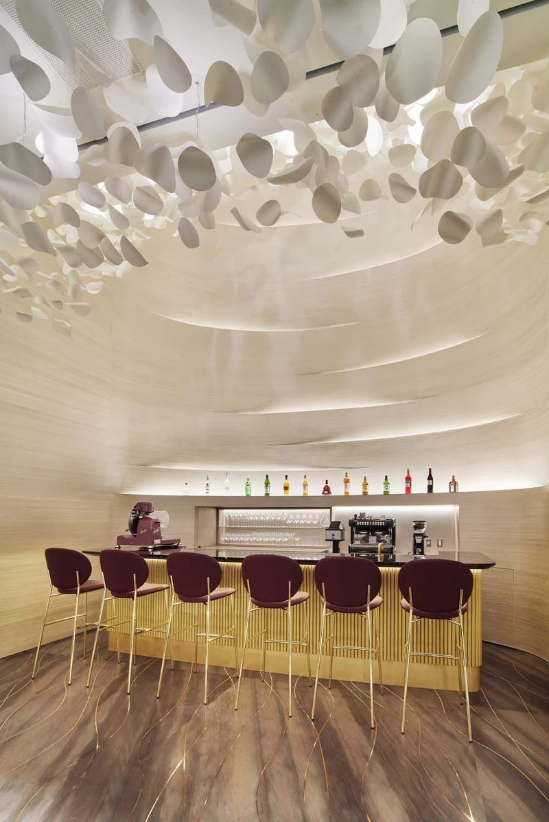 除了建築外觀,室內空間也應用了「流水」的設計:位於店中央的木製樓梯以不規則的曲線一路蜿蜒向上、櫃檯以及天花板亦呈現天然的水波線條,並掛有巨型的水母造型燈飾,在在都與水之意象有所相關。