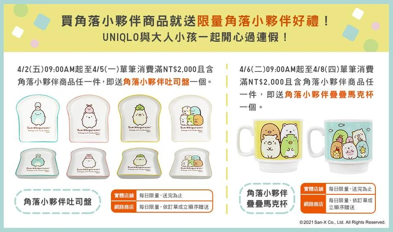 廣受小朋友們喜愛的角落小夥伴,軟萌模樣令人難以抗拒。此次聯名以角落小夥伴出發前往Tapioca樂園玩耍的歡樂畫面作為服飾圖樣,粉嫩色調呼應每個人心中的活潑青春氣息。單筆消費滿NT$2,000(需含至少一件角落小夥伴Sumikkogurashi UT系列服飾),就送角落小夥伴吐司盤或馬克杯乙個。