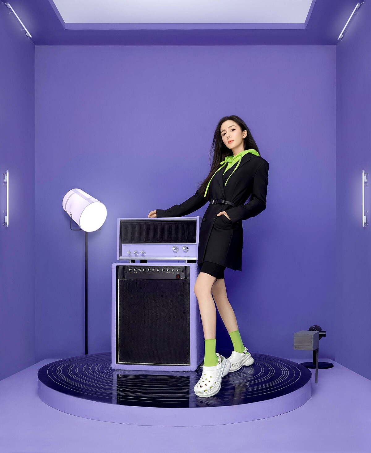 看看Crocs全球品牌代言人楊冪搶先穿上白色鉚釘老爹克駱格的LOOK,她大膽以全黑色調X潮流螢光綠的搶眼襪子搭配,別緻的將鉚釘Jibbitz鞋扣分別扣在後跟鞋帶與鞋面,休閒中帶點正式感,俏麗中帶點霸氣率性。