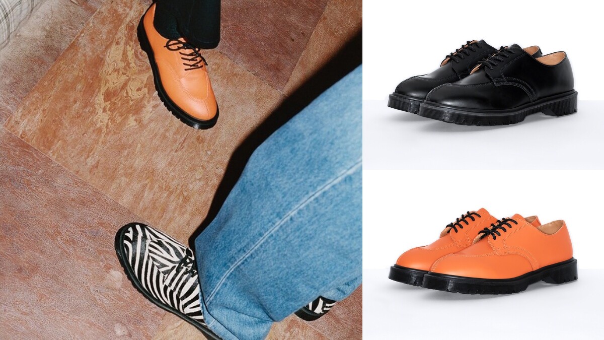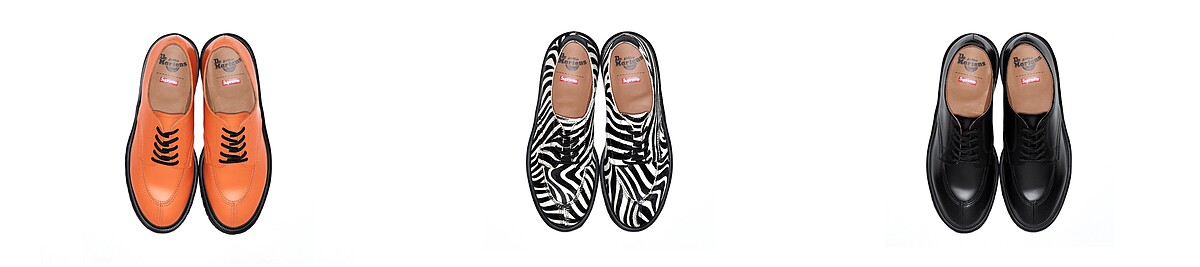 不同於馬汀既有的1461或3989皮鞋,本次Supreme X Dr. Martens聯名鞋,楦頭較窄,鞋面上也多了一些立體縫線的車工,並一次推出三種配色,包含經典百搭的黑色,另外還有比較特別的南瓜橘色與斑馬動物紋。黑色與橘色的款式,以Dr. Martens較為常見的亮面皮革製作。
