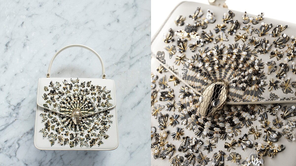 本次聯名的重生蛻變意象,便可以在Serpenti Metamorphosis手提肩背包包的翻蓋上一目瞭然——經典的Serpenti蛇頭作為包包扣環,並以其為圓心向外擴散,蛇身盤繞於四周,漸變為振翅飛起的蝴蝶群們。Serpenti Metamorphosis手提肩背包以小羊皮革作為包包主體,將圖樣繡於皮革面料再以珠飾縫製加工而成,需要至少40小時才能完成一個包,相當費時、費工!