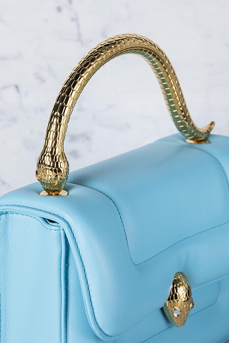 另一款提包,也是天后蔡依林入手的包款,參考自BVLGARI過去所推出過的Serpenti設計作品,第一次以金屬提把取代皮革材質!將蛇舞動、拱起身的瞬間做成包包提把,零死角的細節處理,完美結合皮件設計與寶格麗的珠寶工藝。