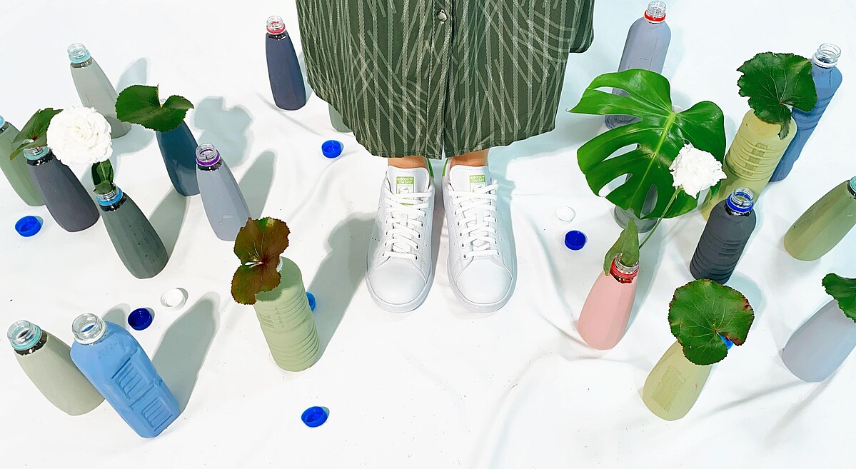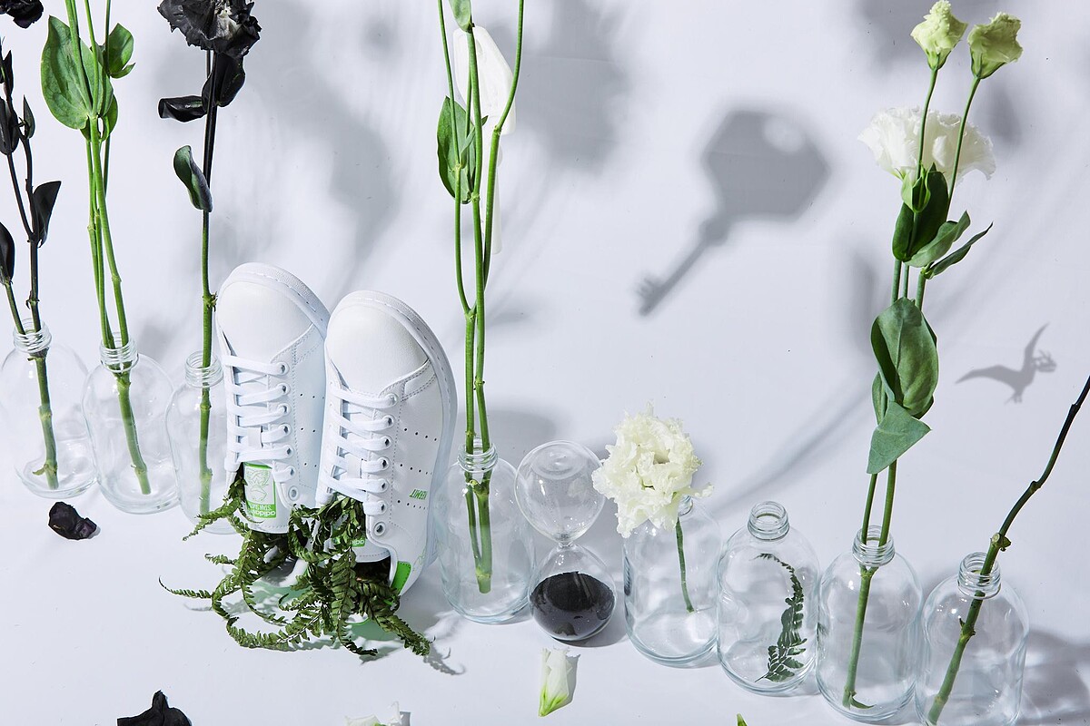 從2021年起,Stan Smith已經全面採用Primegreen高機能再生材質打造鞋面,落實永續環保的理念,此次迎接世界地球日adidas Originals與Apujan聯手,將工作室回收材料像是回收玻璃瓶、寶特瓶、工作室植物,再搭配上綠色服裝系列,結合先前與Disney推出聯名系列的Stan Smith,拍攝永續視覺形象照片。