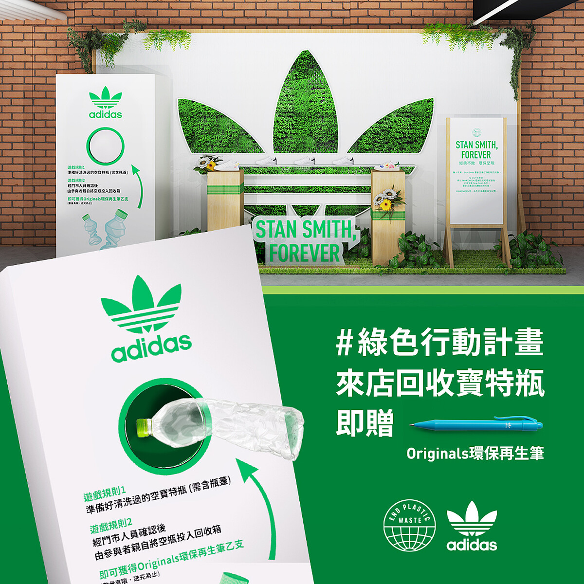 此外,adidas Originals更與台灣在地綠色組織zero zero合作,在北、中、南指定店鋪打造永續回收站,包含台北忠孝經典門市、台中悠跑太平及高雄文橫經典門市,只要到adidas Originals設立的永續回收站投入保特瓶,就能獲得限量環保再生筆1支。