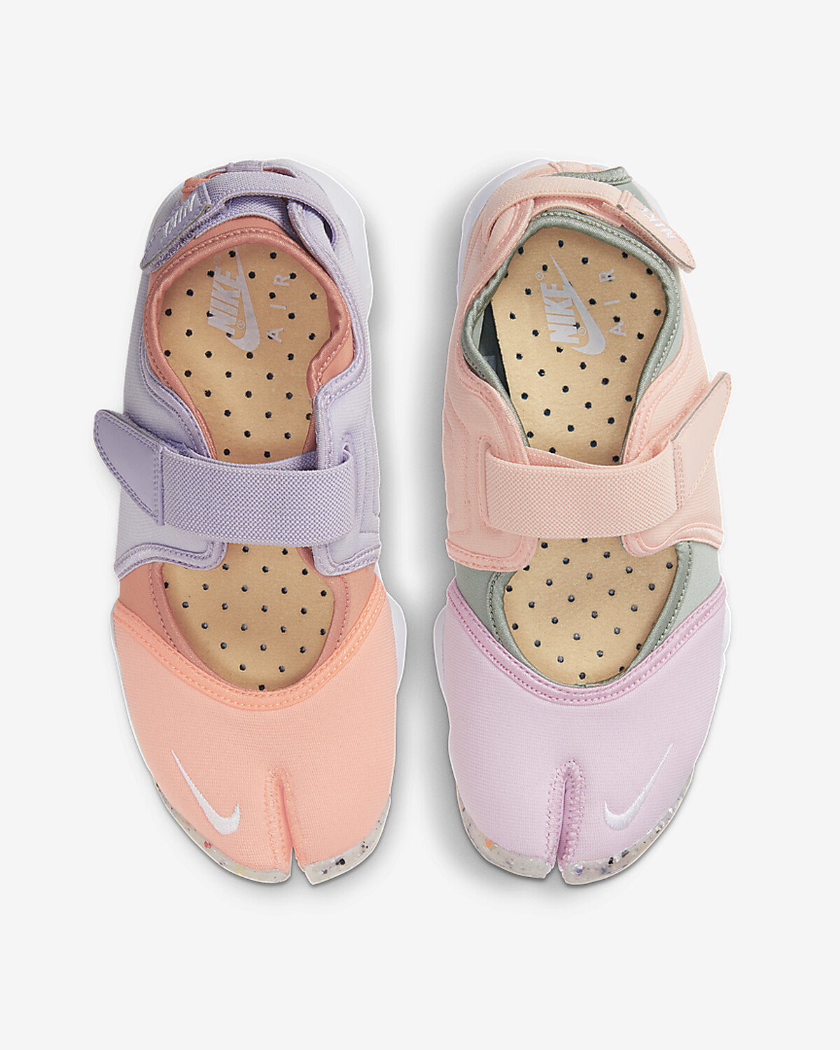 以極適合春夏的鮭魚粉橘、薰衣草紫、嫩粉色以及灰綠色拼接而成,最新的Nike忍者鞋還故意做出不對稱的配色設計,更顯分趾鞋的玩味氣息。