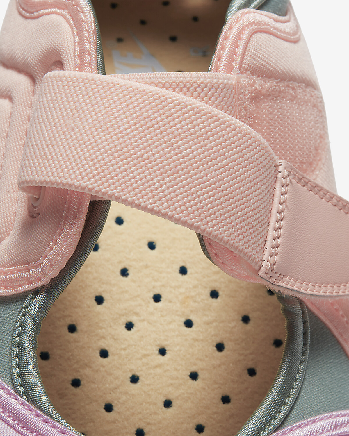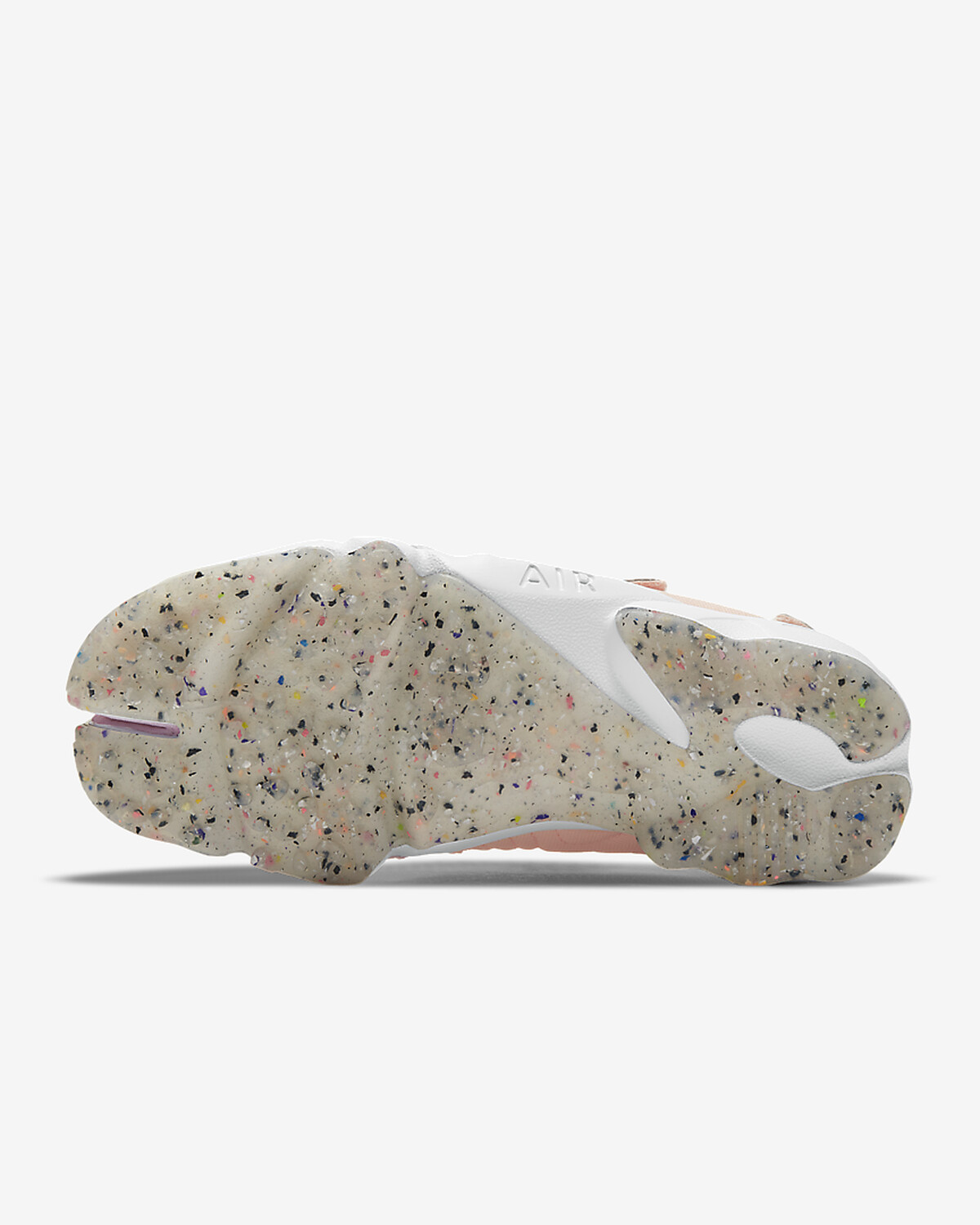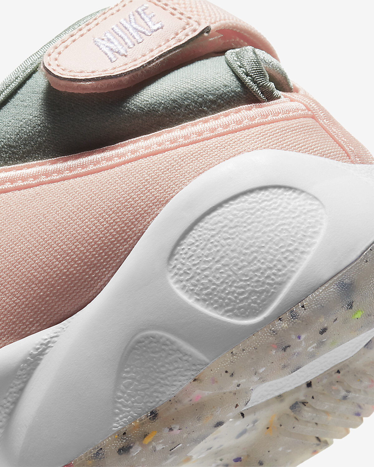 鞋子本身附有魔鬼氈束帶,可以輕輕鬆鬆穿脫鞋子。鞋底的部分,以防震的白色泡棉中底,舒適程度宛如行走在鬆軟的沙灘上;搭配5%環保再生材質的橡膠外底,除了有防滑、抓地功能,繽紛的洗石子斑點紋理細節也超可愛,與鞋身的粉嫩配色相呼應。