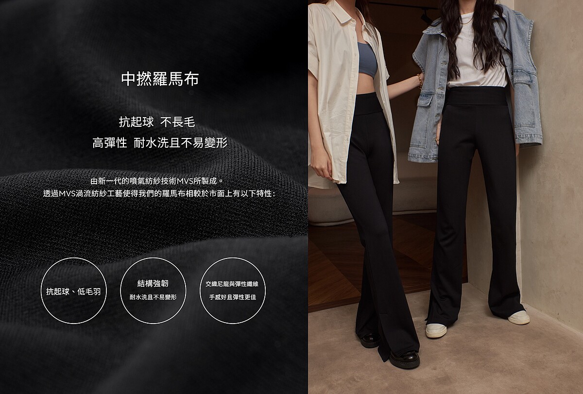 布料也是一絕,MORE REAL顯瘦開岔長腿褲自己獨家開發的中橪羅馬布,手感絕佳彈性一流,穿上後怎麼行動都不會有束縛緊繃感,材質上更以耐水洗、不容易及起毛球的特性,輕鬆就能作到日常清潔,一件可以穿超久的高CP值美褲,就問誰能逃得過這樣無敵的魅力啊~難怪一年四季都是瘋狂熱賣的節奏。