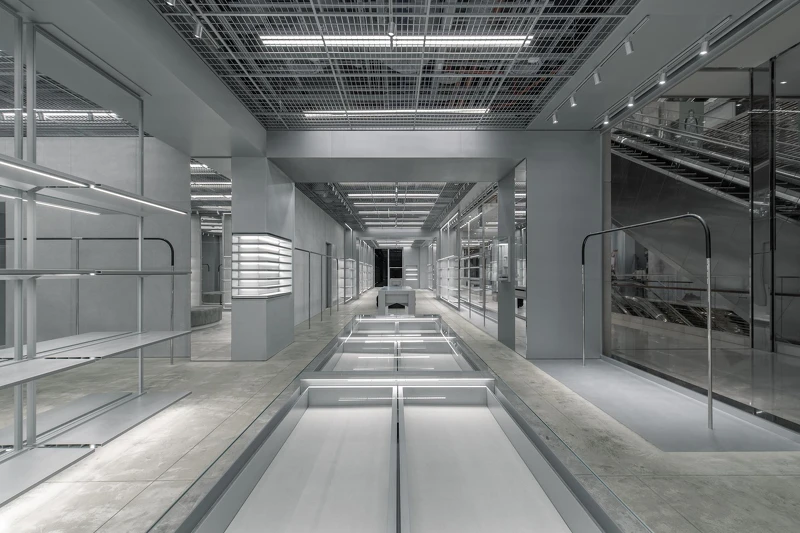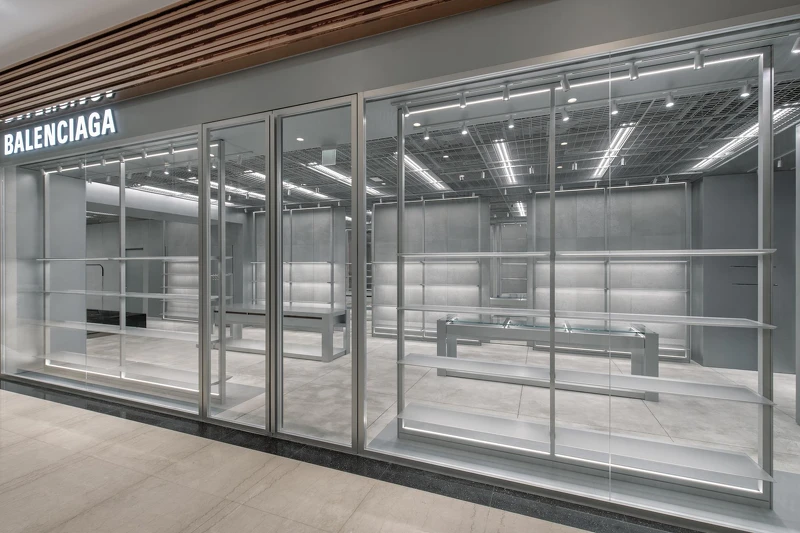 Balenciaga微風信義店將店鋪擴大至115坪,整間店換上極為現代感的灰銀色系,一走進百貨,映入眼簾的是大片的玻璃帷幕,可以一眼望盡店內斑駁的混凝土打造的牆面和地板,一統的銀灰色調,使得整體空間視覺上看起來更加寬敞。