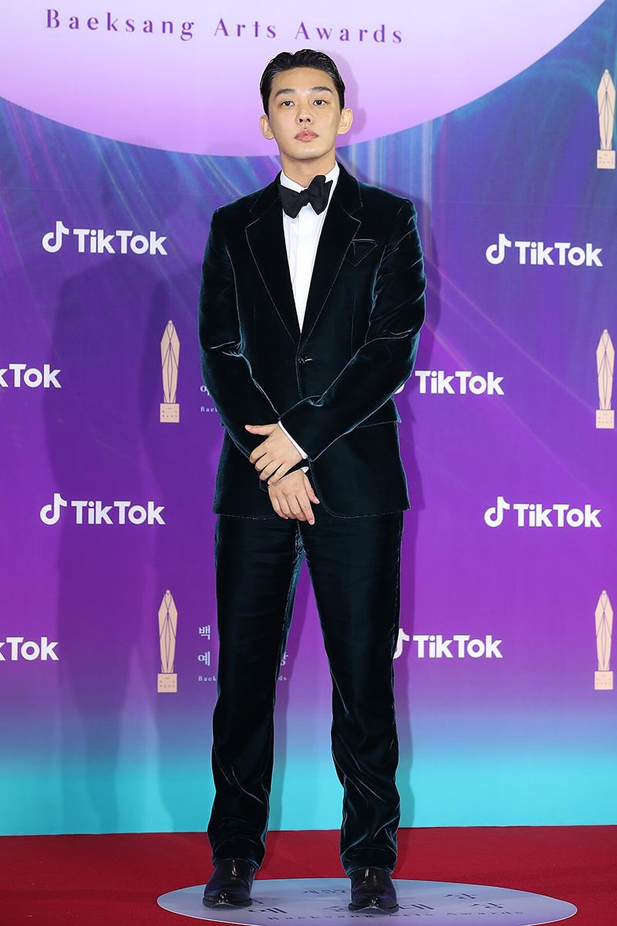 獲得第57屆百想藝術大賞影帝的劉亞仁,則是以深色燈芯絨西裝參加頒獎典禮,在燈光的變化下,燈芯絨透出藍色光澤,十分別緻。