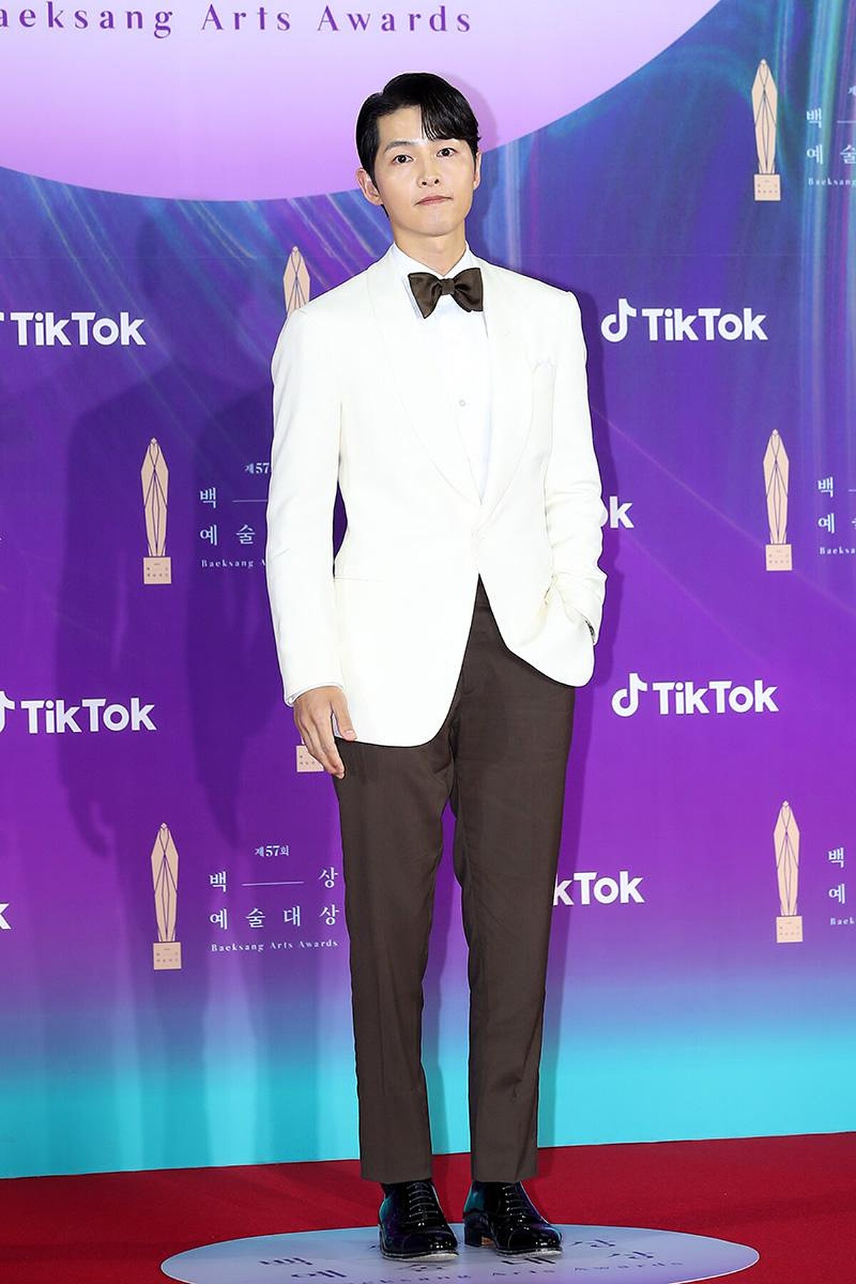 雖然無緣拿下電視部門男子最優秀演技獎,不過宋仲基一登上紅毯,注定成為典禮前5帥,不與其他男星一樣選擇黑色西裝,而是大膽換上白色西裝外套、深棕色西裝褲,搭配同為棕色的蝴蝶領結,氣質翩翩最佳代表非他莫屬。
