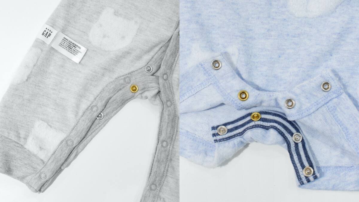 包屁衣脫很方便,但是在穿的時候卻有些難度,尤其當寶寶扭動的時候更是不容易。Gap把一整排的銀色按壓釦,在褲襠的位置刻意縫上一顆金色釦子,讓爸媽們一眼就認出釦子之間的相對位置,讓扣釦子更加方便。