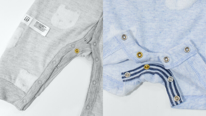 大部分的嬰兒服飾,領口多為固定的設計,然而有些大頭寶寶因為頭圍比一般嬰兒大,讓爸媽只好購買大一號的包屁衣,就會導致無法固定尿布。Gap將包屁衣領口提供了2種不同的調節式設計:一是做按壓釦的設計;二是將領口布料交疊,翻開就可以增加領口寬度。不只大頭寶寶方便穿脫,一般嬰兒也不用擔心拉扯到領口。