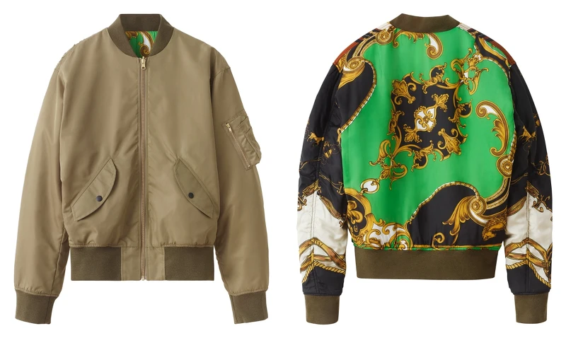 最後一件要推薦的,也是來自男裝部的夾克,兩面採不一樣的面料——一為帶綠的駝色布料、另一為印花絲巾,一夾克有兩種穿法真的很划算!