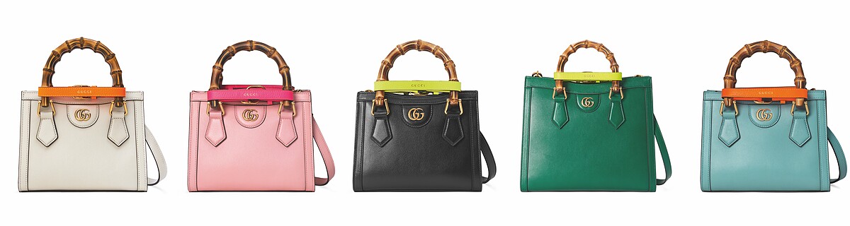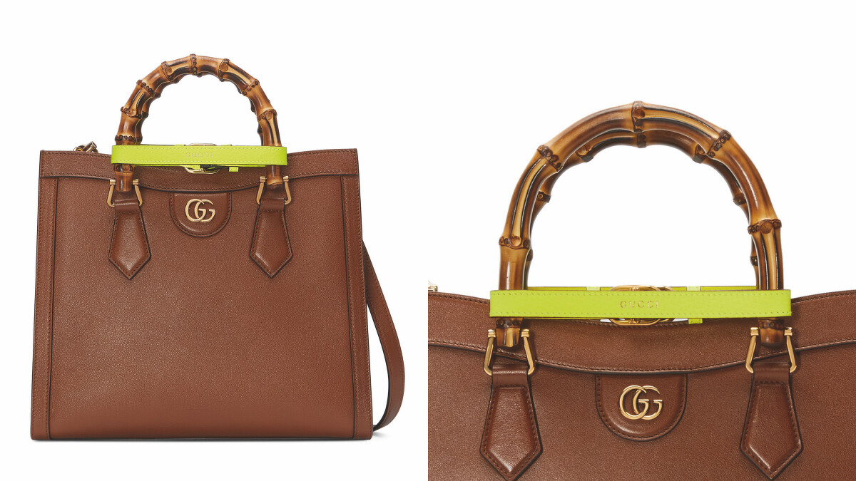 而最新的Gucci Diana復刻款,換以素色皮革面料製作,並在包包正面增添「GG」logo的金屬飾釦,保留了原本標誌性的竹節提把,另外在提把加上螢光色系的皮革束帶點綴,推出大中小與許多顏色的選擇。