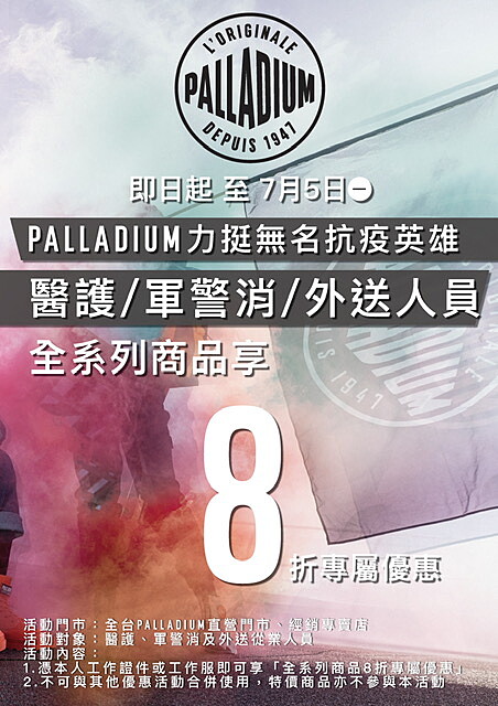 1947年創立於法國里昂的Palladium,於2010年插旗台灣,超過10年從來不曾獻出折扣優惠,此次為了感謝防疫的前線人員,Palladium希望能以自身微小力量,陪伴所有抗疫英雄一同前進渡過艱難時刻,迎接不久的全新未來。