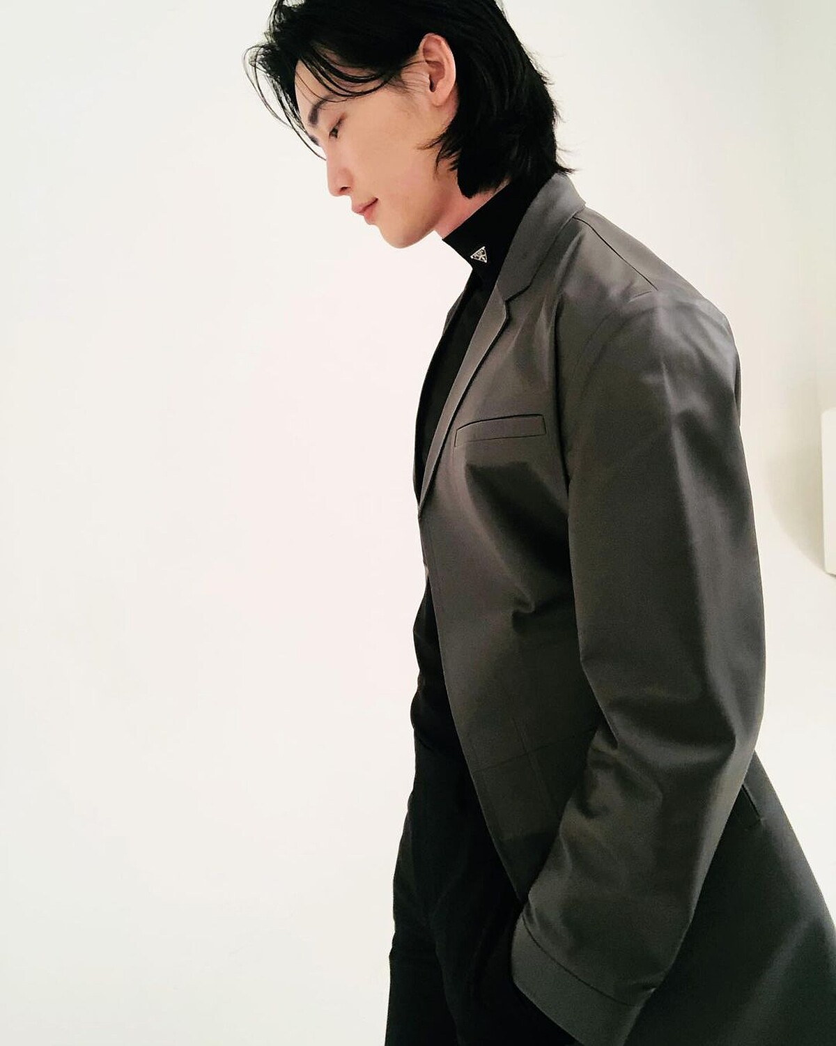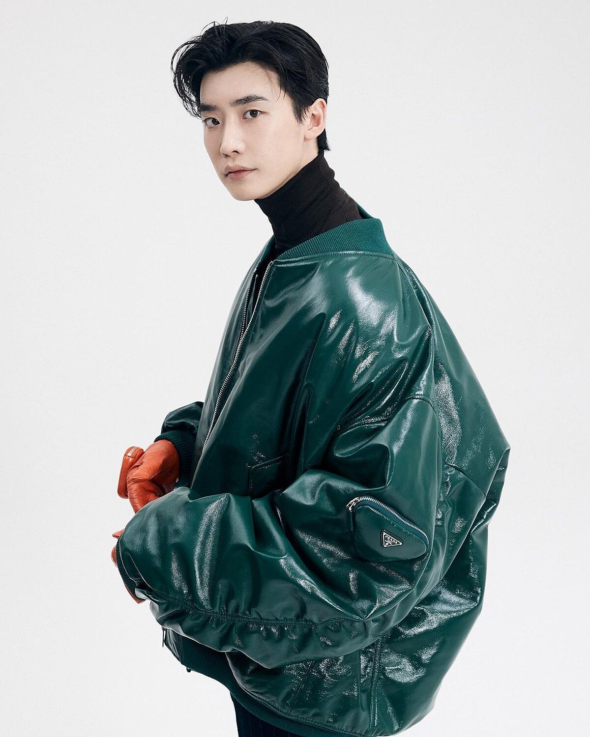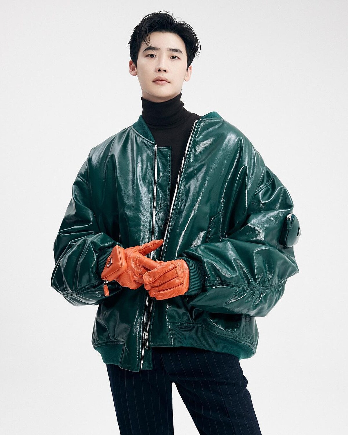 李鍾碩自退伍後的長髮造型也留了半年之久,還以為再也看不到過往的帥氣短髮,在Prada 2022春夏男裝系列發表前夕,歐巴在Instagram搶先曝光自己最新造型,正是大家思思念念的短髮版本,選擇高領套頭上衣、條紋長褲搭配深綠色飛行外套回歸,手上還配戴Prada亮橘色配件手套。