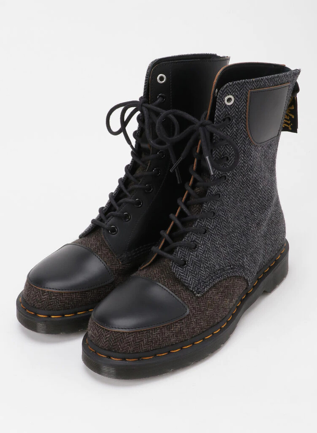 最新的Y’s X Dr. Martens 10-Eye Boot Moon Fabric聯名靴選定十孔的馬汀短靴鞋型,可以從鞋面上看到是採用深灰、深棕兩種不同顏色的軟呢材料與皮革拼接而成。