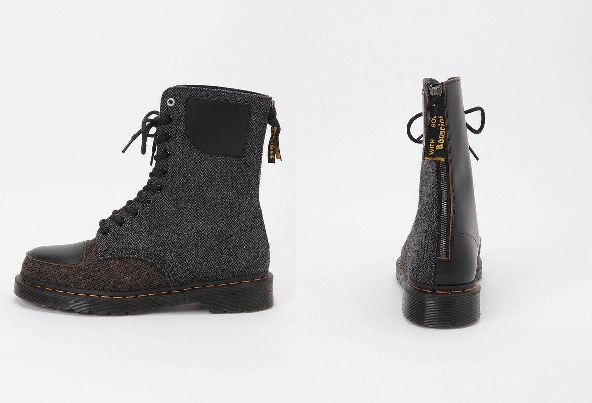 本次特別選用帶有人字型紋路的軟呢布,在靴頭的位置以及兩側有大小不同的黑色皮革面料;拉鍊則是被放置在靴子的後側,以馬汀招牌的黑黃織帶作為點綴。