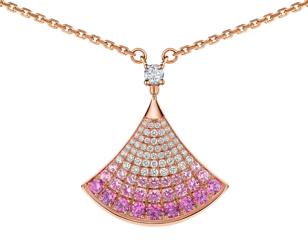 BVLGARI Divas’ Dream 系列玫瑰金鑽石與粉紅剛玉項鍊 參考售價:約新台幣 146,300 元 俏皮優雅的立體扇形吊墜,設計靈感大有文化意涵,來自羅馬卡拉卡拉浴場馬賽克圖案,此款以漸層排列的粉紅剛玉及鑽石為主導素材/色彩,背面金工鏤空處理,讓項鍊戴起來更輕盈、光暈亮得更微妙。