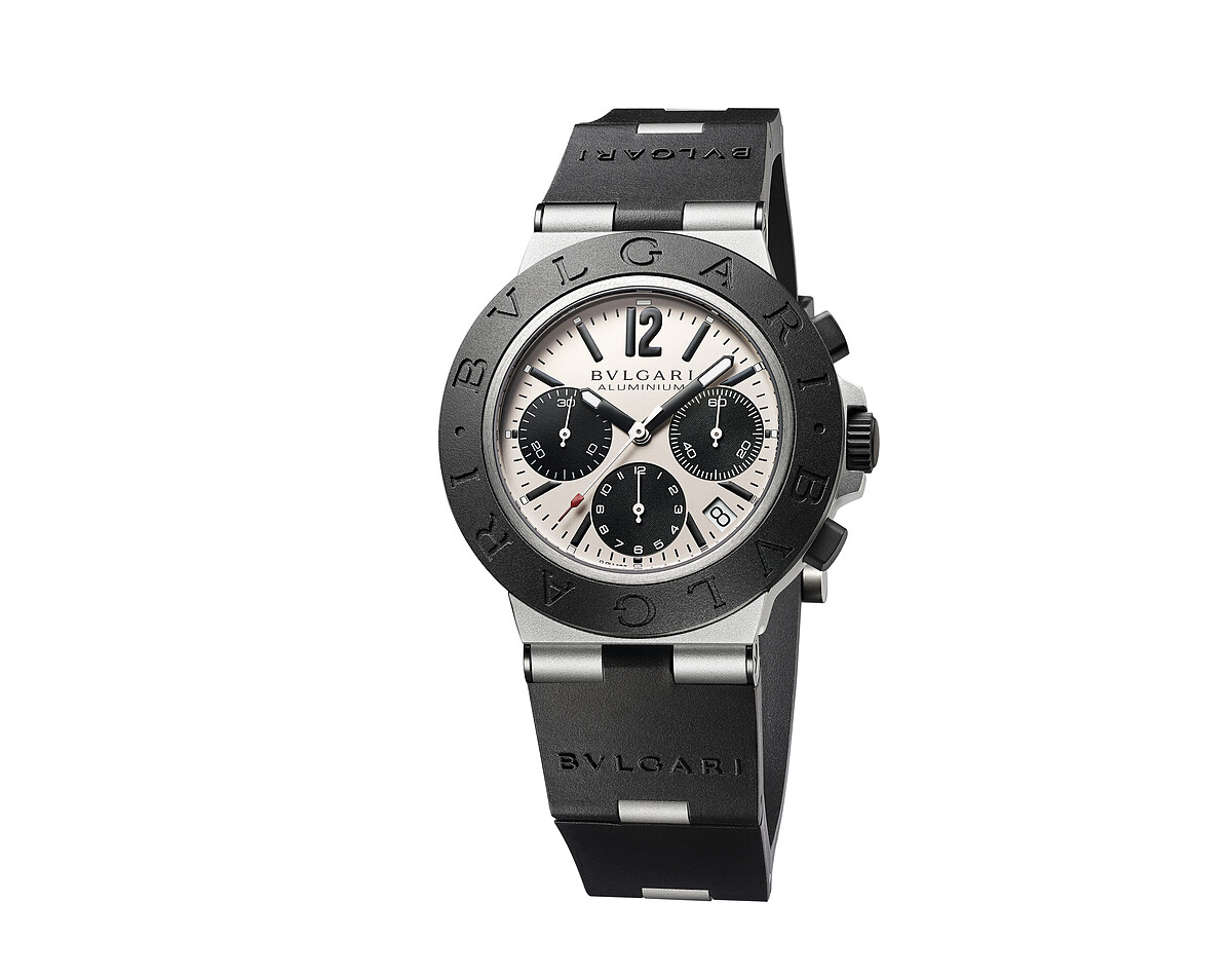BVLGARI ALUMINIUM系列鋁合金計時腕錶 機芯 自動上鍊 B130 caliber 機械機芯,42 小時動力儲存,計時碼表功能。 錶殼與錶盤 錶徑40 MM,鋁錶殼,搭配 DLC 處理鈦金屬底蓋和橡膠錶圈;DLC處理鈦金屬錶冠;暖灰色錶盤搭配 SNL 時標與指針,黑色的計時碼表錶盤,防水深度 100 公尺,日期顯示功能。 錶帶 橡膠錶帶搭配鋁金屬鏈節、鋁金屬針式錶扣。附專屬鋁和橡膠材質腕錶收納盒。 參考售價:約新台幣131,600元