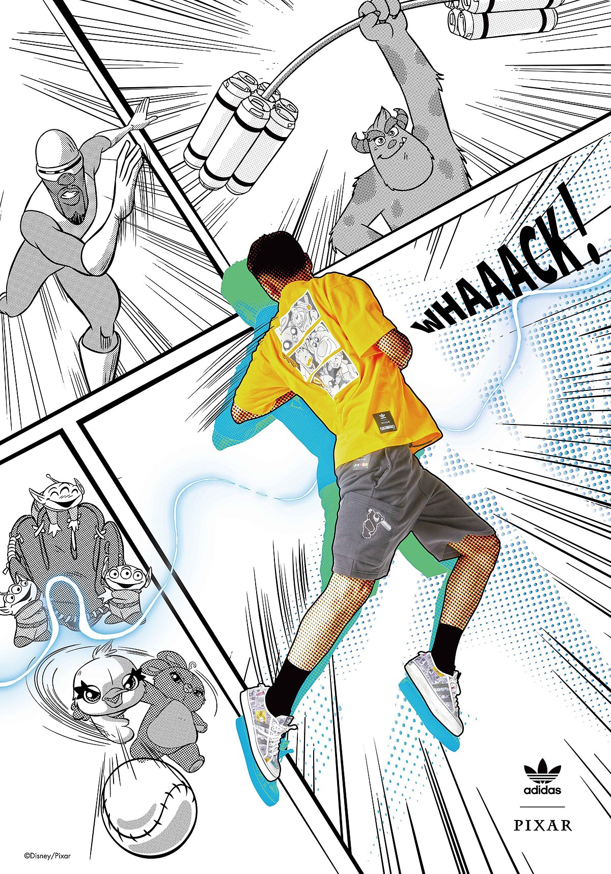 呼應夏天各地正在如火如荼進行的各種運動賽事,adidas Originals決定以日本的漫畫手法來詮釋這一次的聯名,讓巴斯光年、毛怪、彈力女超人等以運動員的姿態登場。