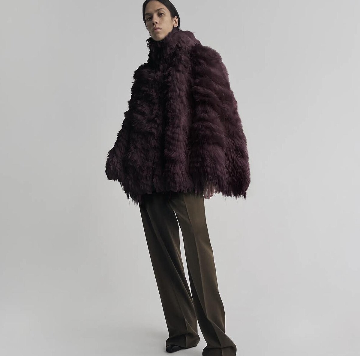 長如地毯的絨毛材質在Phoebe Philo的首個作品中扮演重要亮點角色,以大面積的方式鋪張在大夾克、西裝褲上。