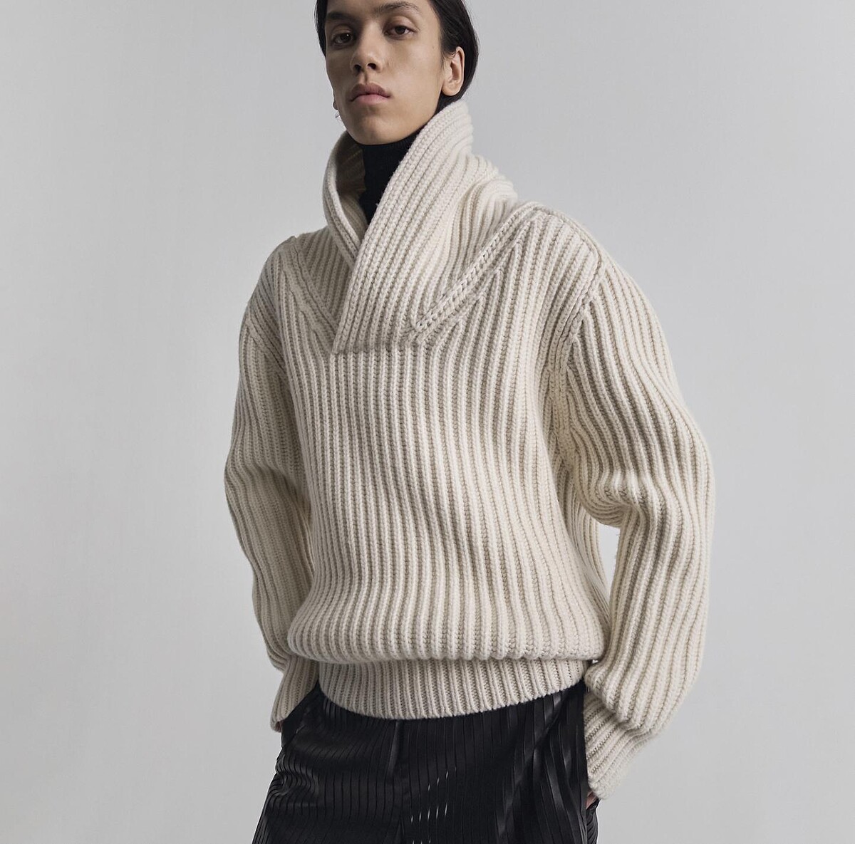 Phoebe Philo推出的針織單品系列,在基礎之上加入了她的極高的辨識度,以粗針織的方式強調紋路,讓針織毛衣與圍脖合為一體,另外也使用異材質拼接方式,凸顯細節控的堅持之處。