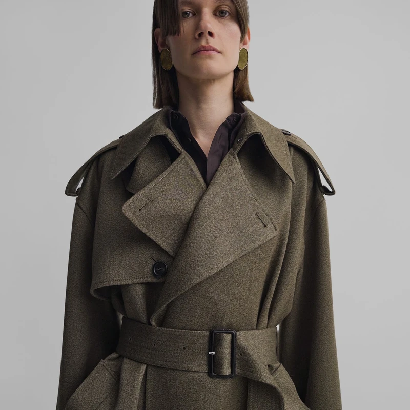 Phoebe Philo個人品牌遵循著永續與永恆的理念,儘管大部分的單品定價高昂,但它們都是經典不敗的款式,能長長久久使用,且在任何時刻拿出來都不失特色,像是A1系列中的這件卡其風衣,除了有極簡俐落的輪廓,在肩膀處加裝了巨大的扣子,並能用於裝卸同組的披肩圍巾,讓穿著者能隨時自由變化。
