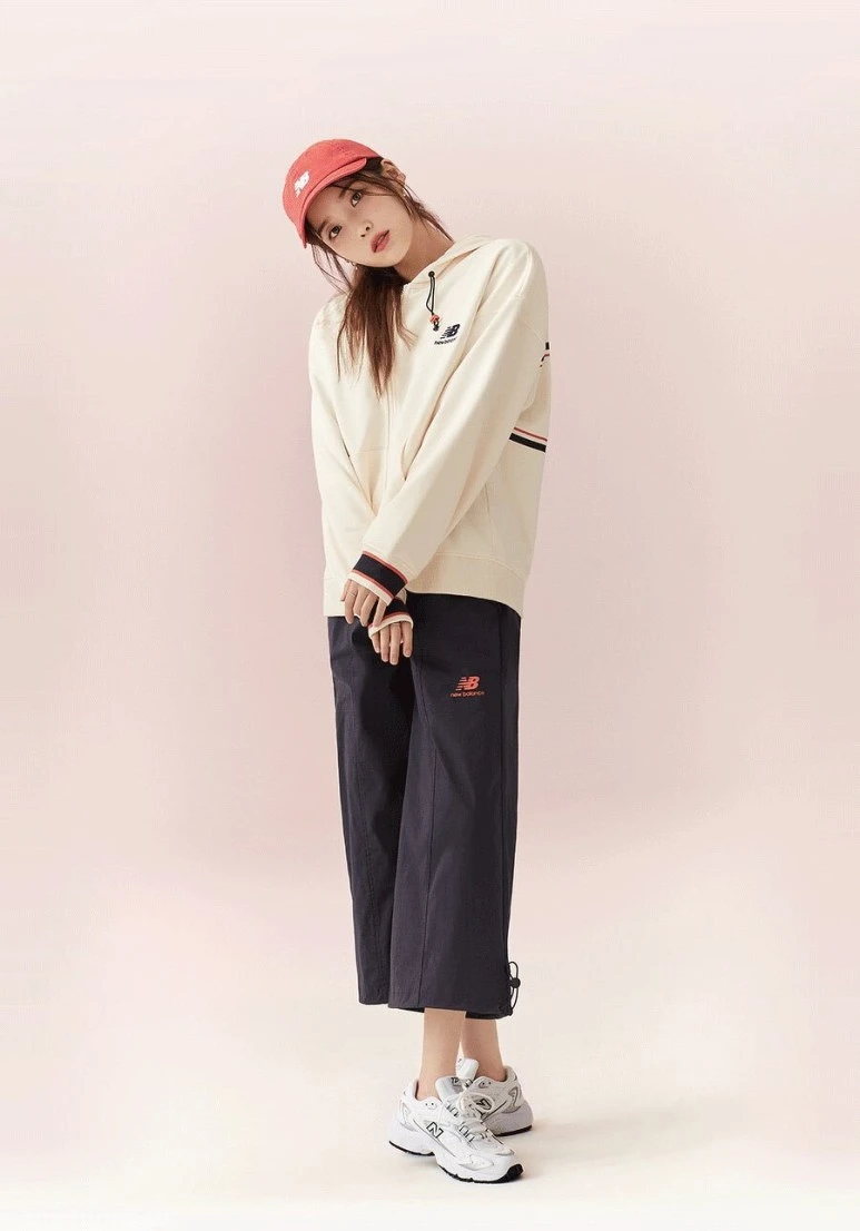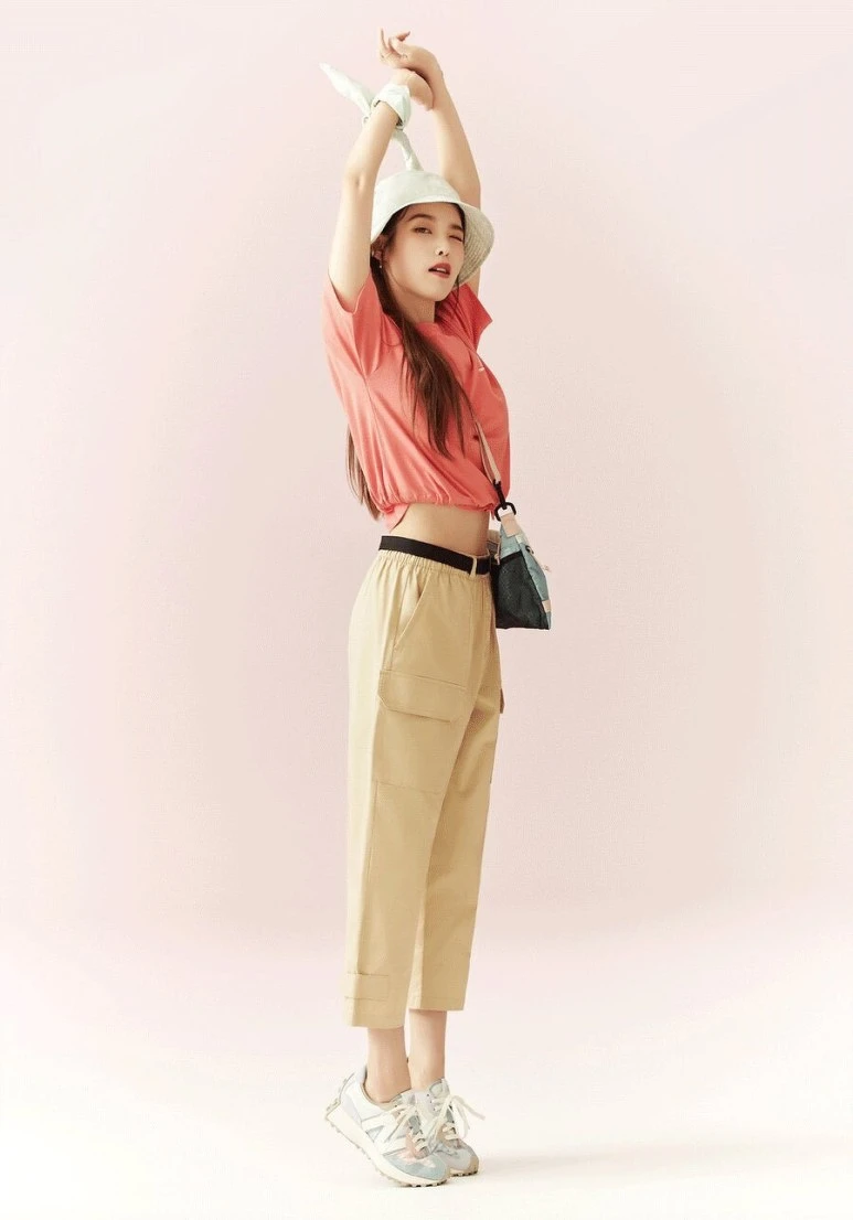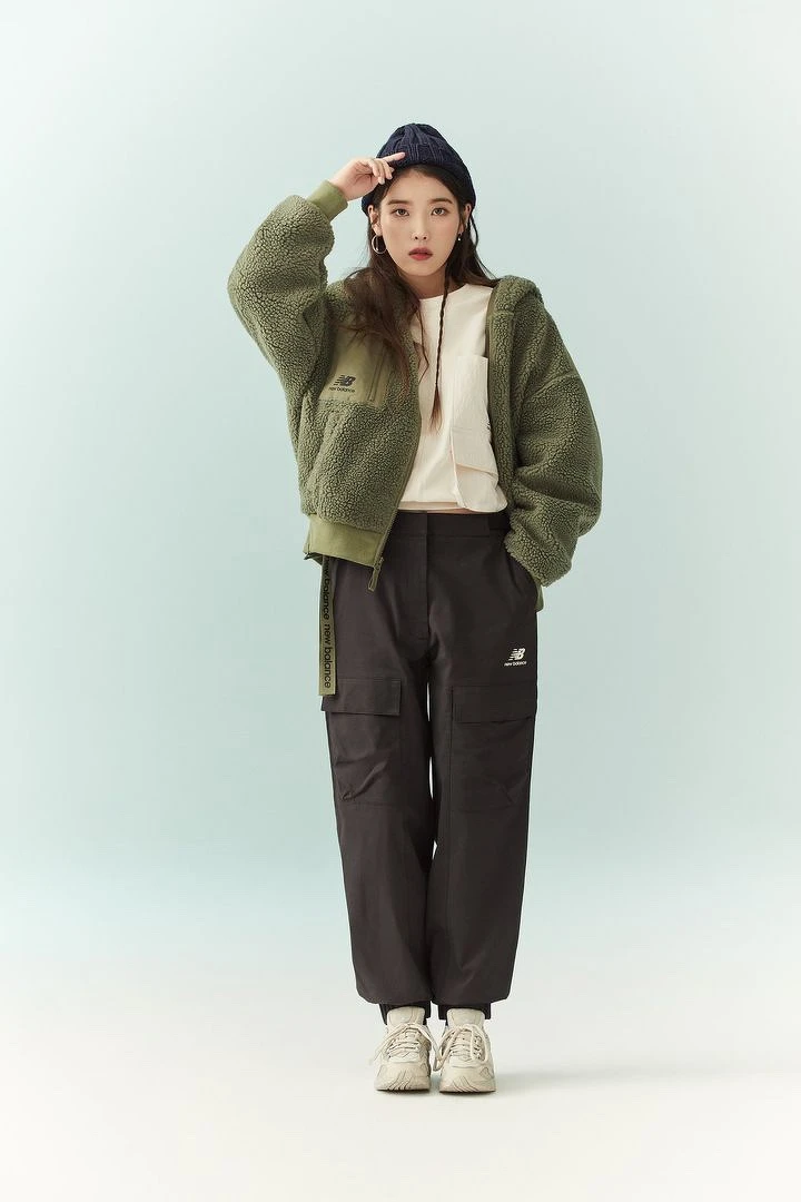 第二波公開的球鞋是New Balance最新成員57/40,IU換上8月主打款,經典灰綴以靛藍、桃紅的繽紛配色,搭配奶油色的工裝造型,穿出IU獨特的清新帥氣魅力。