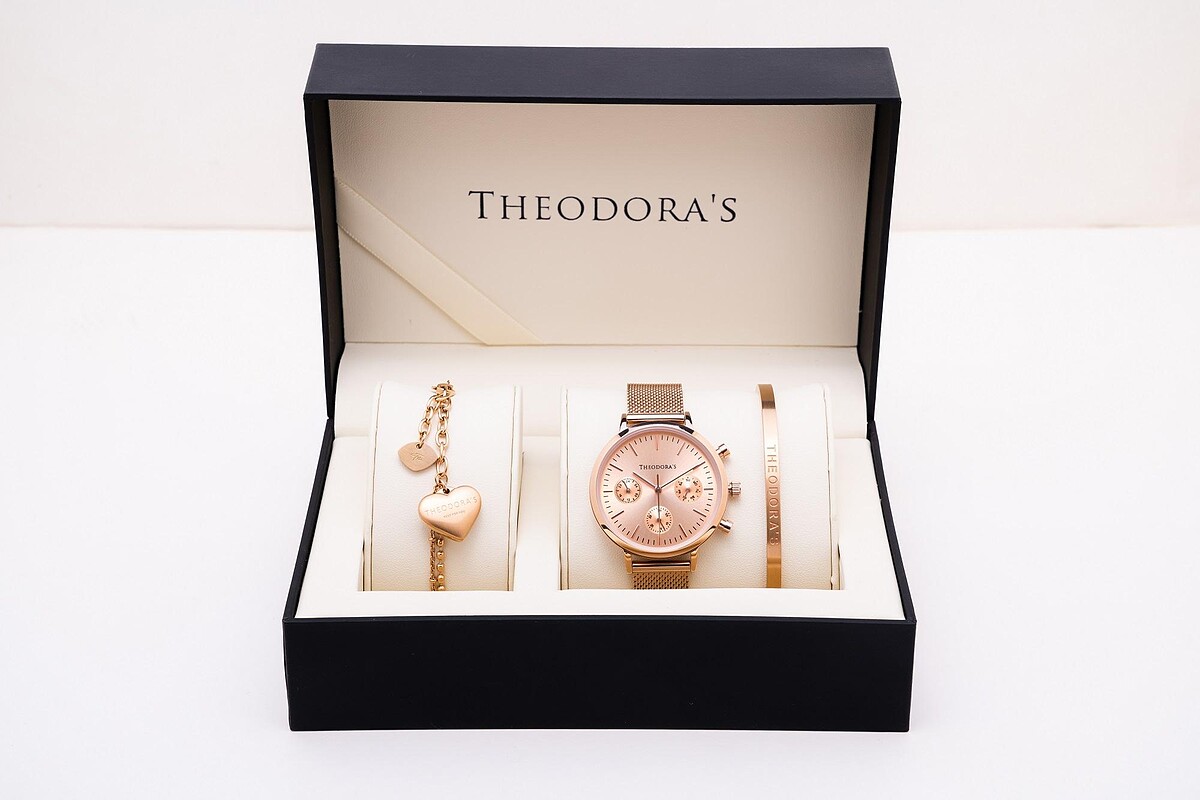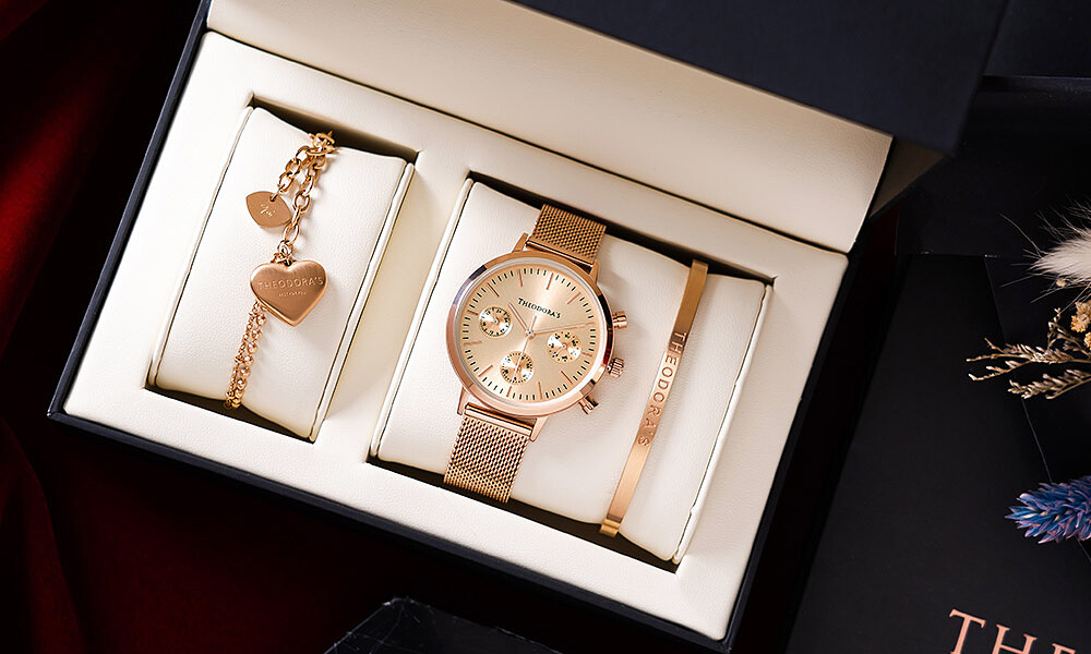 除了對錶系列外,Theodora's希奧朵拉還推出了Apollo玫瑰金手錶搭配西德剛C型手環的對飾禮盒,值得一提的是,西德鋼C型手環可隨意調整尺寸,不需擔心手環過大過小的問題,最適合不清楚另一半手圍的送禮首選。