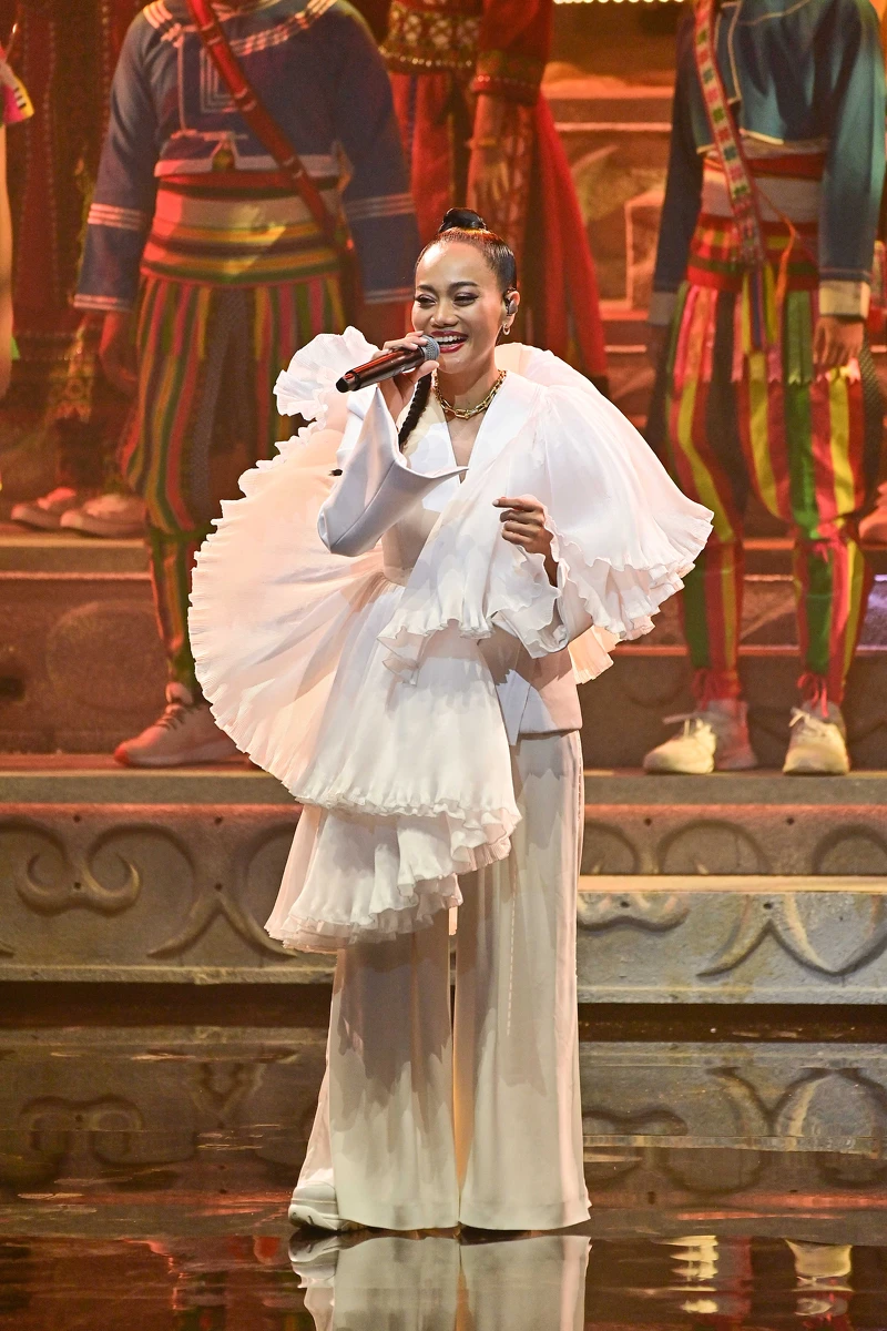去年金曲最大贏家阿爆,今年特別擔任典禮開場表演嘉賓,並換上一身幾合式荷葉邊套裝,呈現她優雅卻不失個人風格的時尚品味。