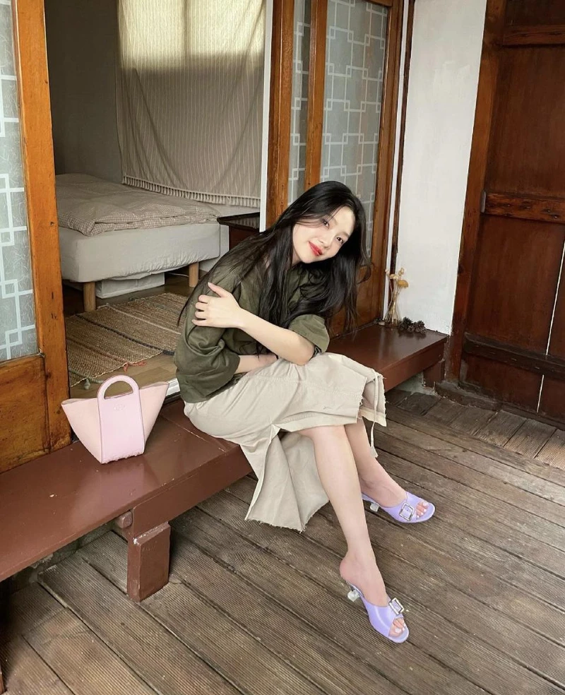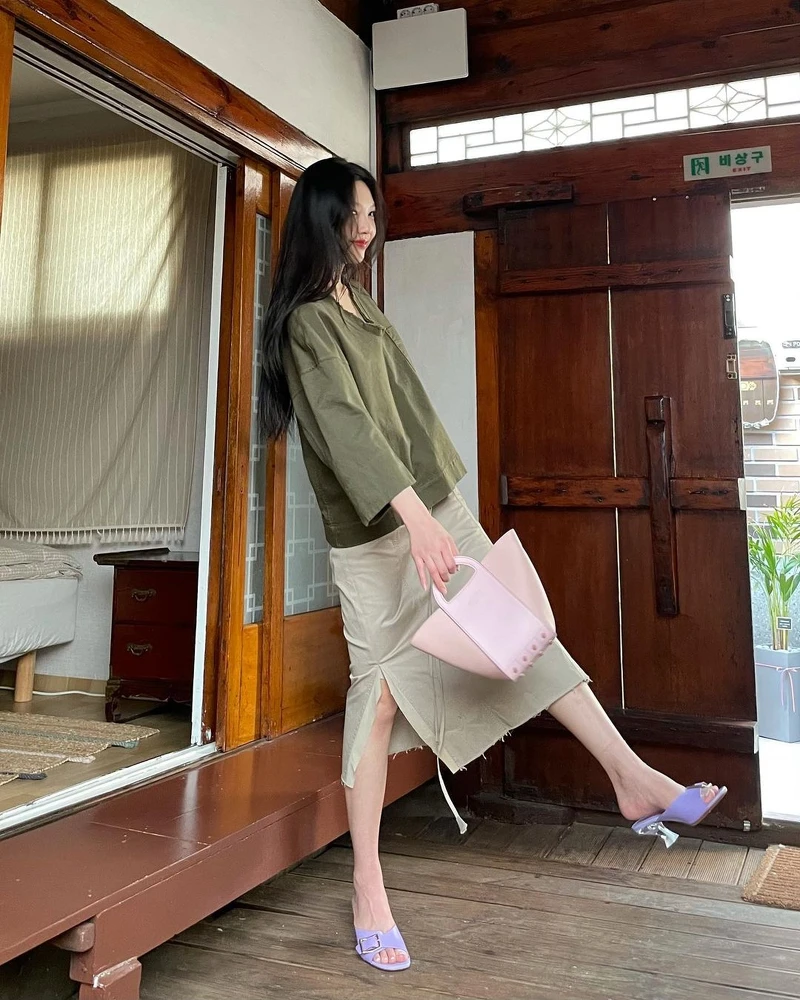 喜歡穿襯衫的上班女孩,不妨學Joy以軍綠色襯衫搭配卡其色裙的穿搭,腳上踩一雙低跟涼鞋,在辦公室登場也不失正式感,非常適合作為女孩們職場穿搭的範本。