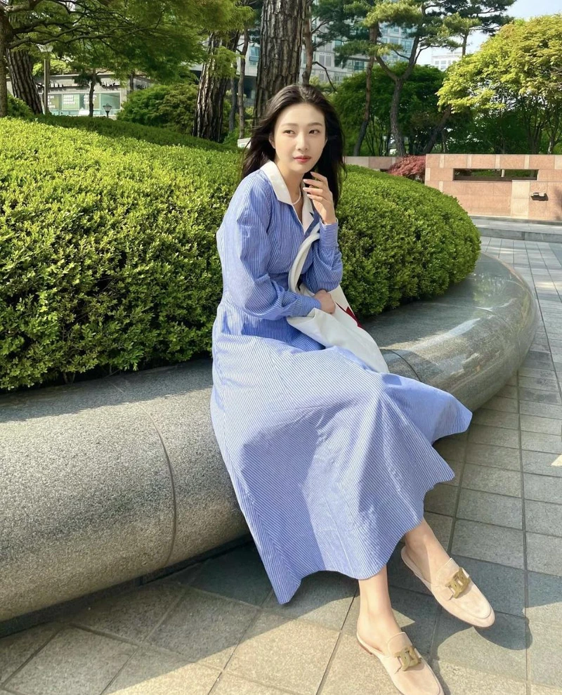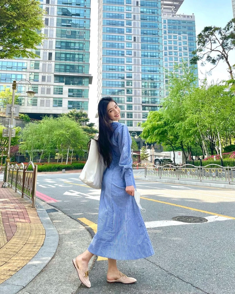 說到辦公室穿搭,並沒有大家所想得那麼難,像Joy一件襯衫式的條紋洋裝搭配你奶茶色穆勒鞋,氣質又正式,職場穿搭焦點一定非她莫屬。