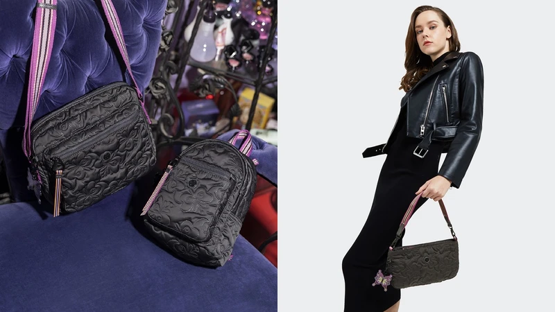將Anna Sui最具代表的蝴蝶圖案蘊藏於質感黑色之中,是本次聯名系列最低調的一款,主打包款為可自行選擇肩背或斜背的MASHA手袋。