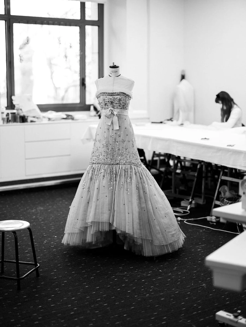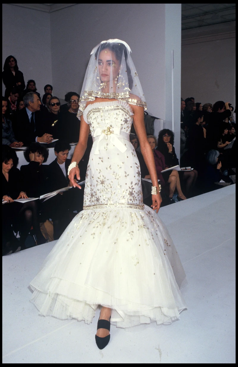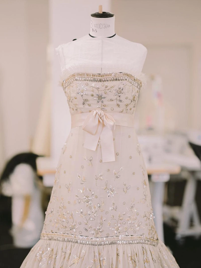 而這一件禮服,其實是來自香奈兒1988年的春夏高訂服系列——細緻的烏干紗,為了重現當年一模一樣的禮服設計,Chanel啟動了品牌底下的Lesage刺繡工坊與Lognon褶飾工坊共同打造,金銀色的珠飾與亮片利用手工的方式一針一線縫上,光是刺繡就費時了700個小時!