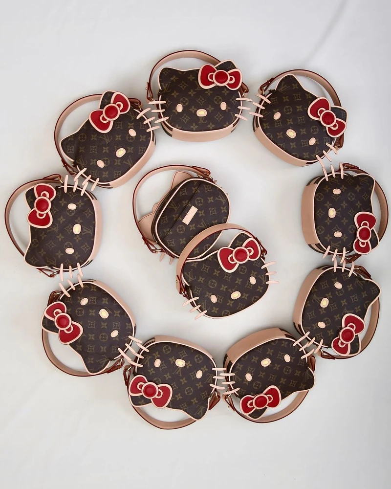 而在今年年初的時候,Sheron Barber秀出一款彩色LV老花的凱蒂貓小包,從路易威登的NéoNéo水桶包取材,並且仿造卡通人物的黑色描邊輪廓,包包的周圍也採用黑色的皮革包邊,配上Hello Kitty的紅色蝴蝶結,精緻程度直逼職人等級。