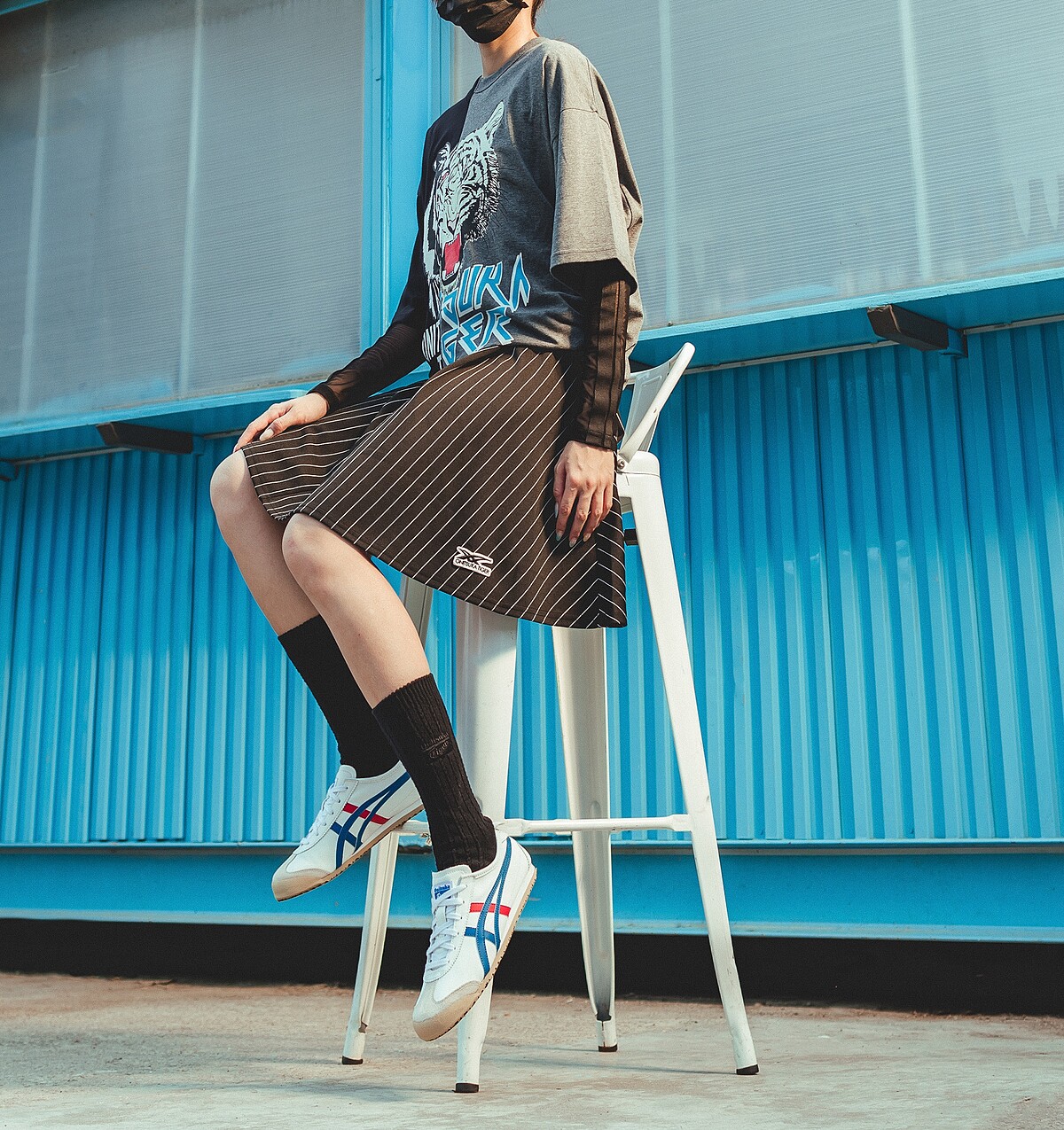 初代MEXICO 66在潮系混搭上可以穿出多種樣貌,麂皮鞋頭的復古流線感與撞色虎爪紋,穿起來俏麗有個性,搭配龐克風的虎頭拼接上衣、內搭透紗拼接條紋洋裝,輕鬆混搭出夏末秋初的層次LOOK。