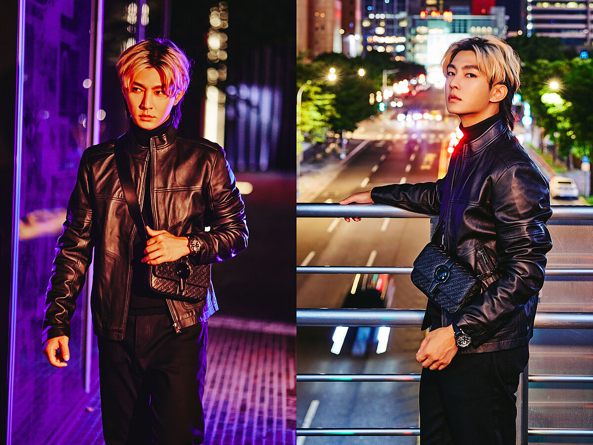 在閃爍著霓虹光線的城市夜景中,炎亞綸以皮革外套來呼應萬寶龍UltraBlack斜背手拿包的高級光澤感,讓全黑系造型在有型中增添了一股魅惑氣息。
