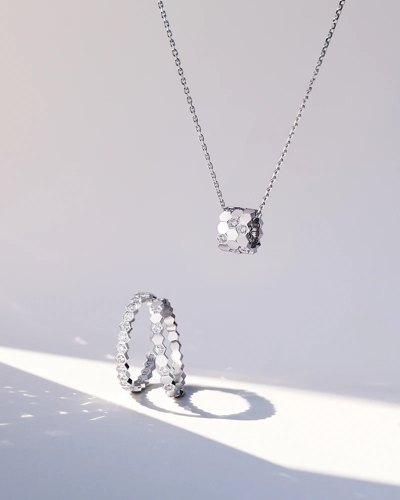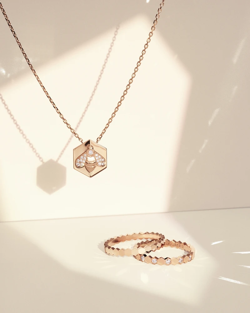 全新Bee My Love系列推出三款吊墜項鍊,有玫瑰金或白金材質、素雅金屬或鑲鑽款;另一款焦點新品是飾有拿破崙皇室象徵的蜜蜂圖案的18K玫瑰金吊墜項鍊;更多以幾何線條詮釋蜂巢設計主題的戒指;鑲嵌Taille Impératrice皇后式切割鑽石的18K玫瑰金項鏈、手鏈和戒指…不論是同系列疊搭,或與既有的首飾混搭都不出錯。