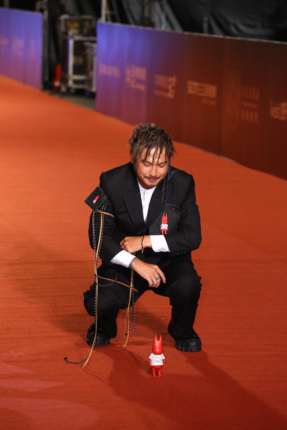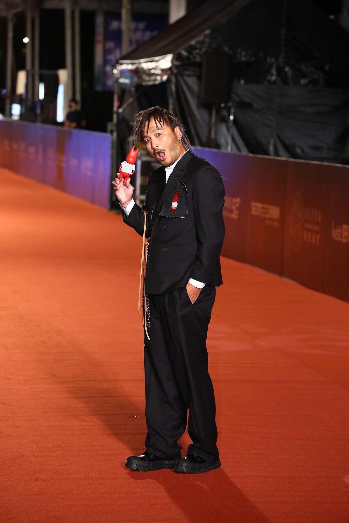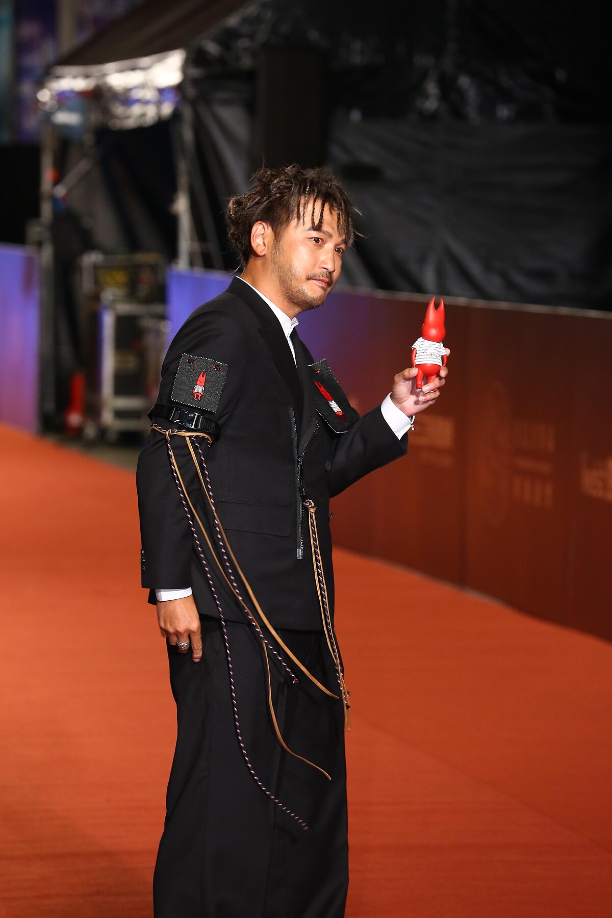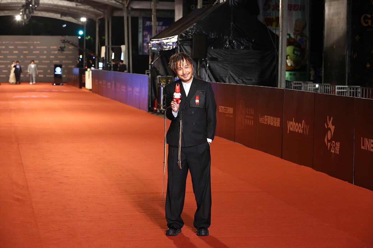 而林柏昇西裝上最大的亮點,便是他胸口與臂膀上的圖章!將小鬼的潮牌Alien 666紅色公仔印製成刺繡貼布,別在外套上,並帶著同款公仔一同走紅毯,象徵著與黃鴻升一起出席今年的金鐘獎。