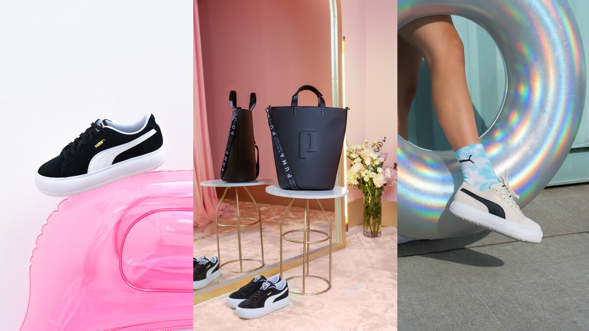 經典黑白配色全新 PUMA SUEDE MAYU 復古龐克厚底美鞋 (建議售價 NT2,980 元) 即將於 9 月 16 日正式登台販售,同步加映採用 VEGAN 全植物認證皮革製成的 PUMA SENSE 微奢精品托特包,除了各大 PUMA 門市專櫃外,也同步上架 PUMA 台灣官方購物網站
