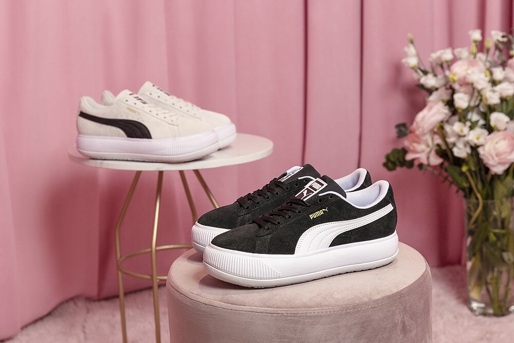 厚底球鞋之王Puma,在10月一開始,與代言人蔡依林再度聯手,呸姊換上Puma全新推出的復古厚底小白鞋SUEDE MAYU,以大膽前衛的球鞋輪廓,結合經典不敗的黑、白配色,搭配頂級的麂皮絨毛材質,還有最吸睛的厚底設計,是今年秋冬必入手的球鞋。