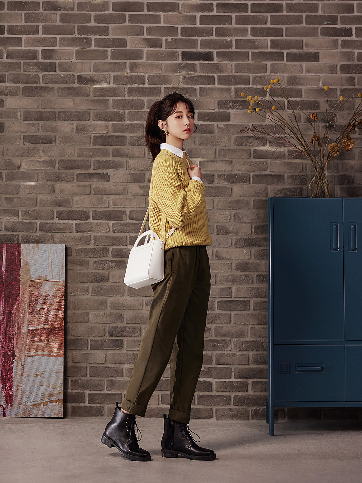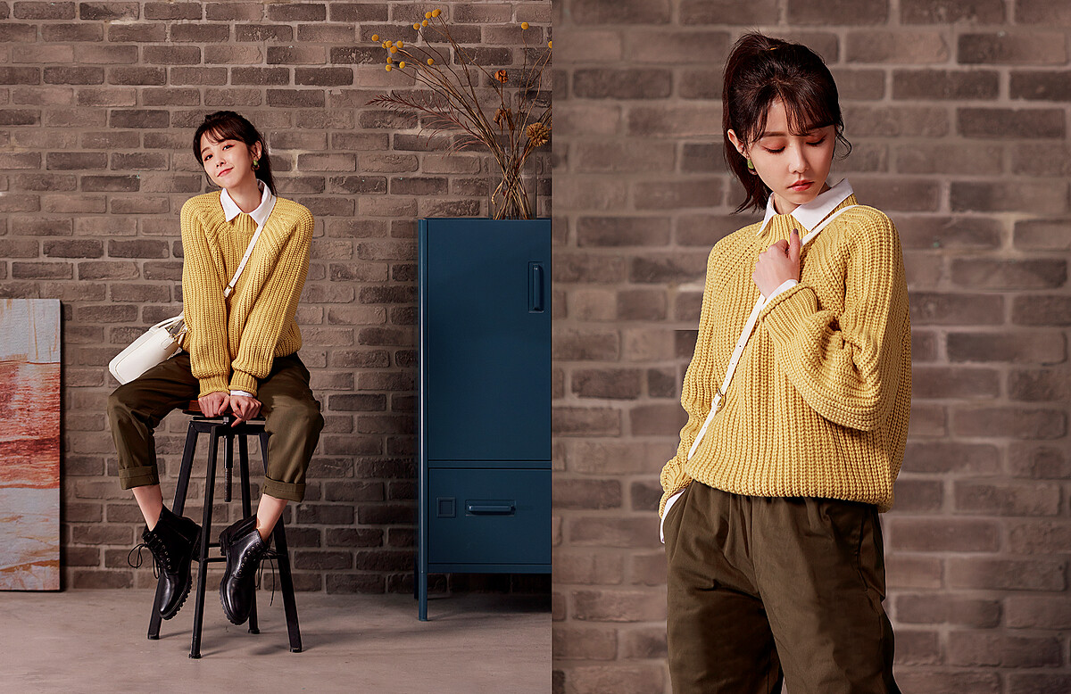 喜歡俐落率性穿著風格的女生,可以跟著邵雨薇的穿搭腳步,以選擇暖色調芥末黃高領針織衫、搭配橄欖綠的GU人氣男裝單品「Chef pants主廚褲」、創造對比層次的有領襯衫作為內搭,再搭上帥氣短靴,隨意背上輕巧白色包款,完美且恰到好處的和諧色調也為中性褲裝增添一抹柔和氛圍,呈現出於深秋時節城市中自在優遊的俏麗文青女孩風格。