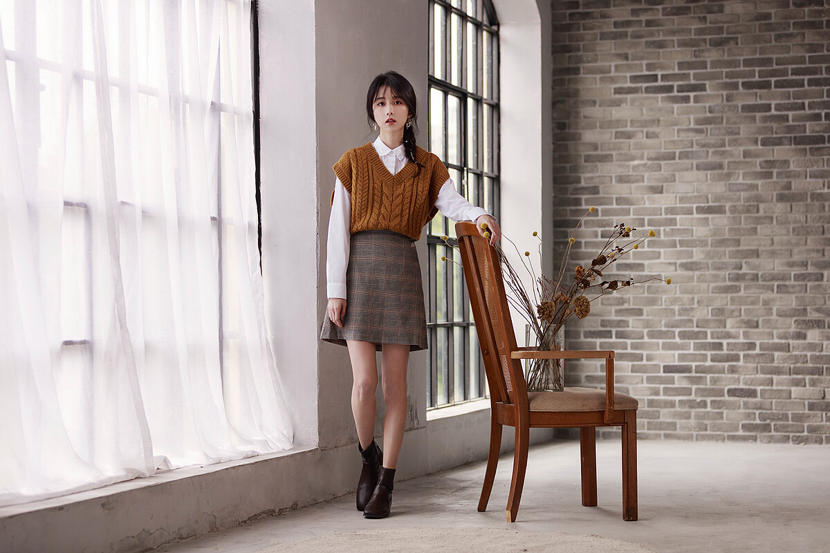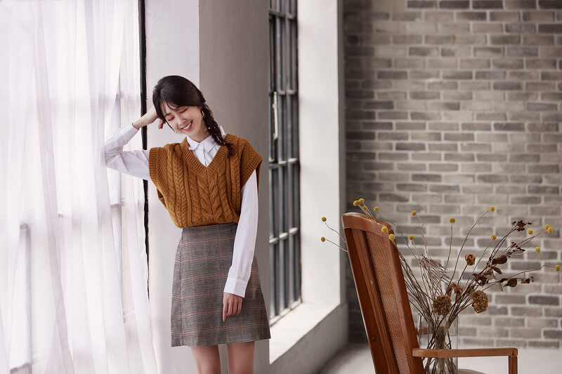 寬鬆的針織背心在這個秋冬是當紅單品,邵雨薇則選擇GU暖褐色調的短版粗紡針織背心作為造型主角,V領融合落肩設計的小心機,不僅可以修飾臉型、使頸部線條更加纖細。搭配領口收束的經典白襯衫,以及復古細格紋短裙,輕鬆穿出深具溫柔氣質感的另一種時髦學院風造型,再透過黑色平底靴彰顯那隱約自我個性態度,所散發的溫柔小姐姐氛圍感,讓人忍不住就想親近多看幾眼。