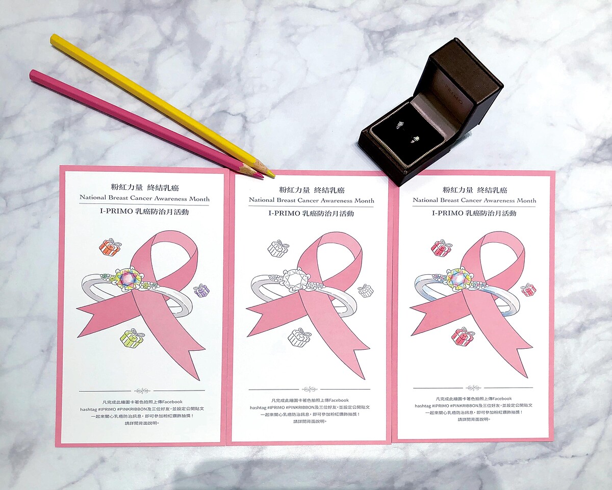 活動辦法 : 凡完成此繪圖卡著色拍照上傳Facebook並hashtag #IPRIMO #PINKRIBBON及三位好友,並設定公開貼文,一起來關心乳癌防治訊息,即可參加粉紅鑽飾抽獎。