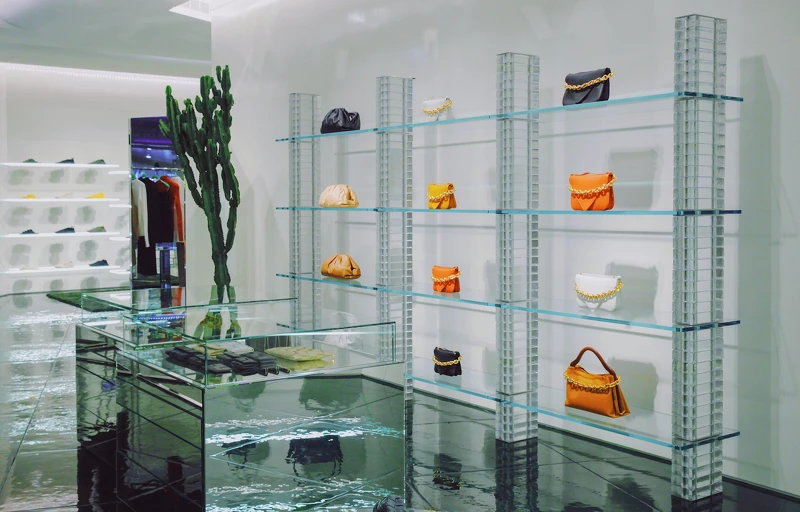 BV的經典符碼在店鋪中處處可見,包括呼應編織工藝的地板設計、鍍鋁合金的三角型衣架,以及陳列架折射的三角型燈光,皆是Daniel Lee為台灣首間BV旗艦店所安排的驚喜細節。