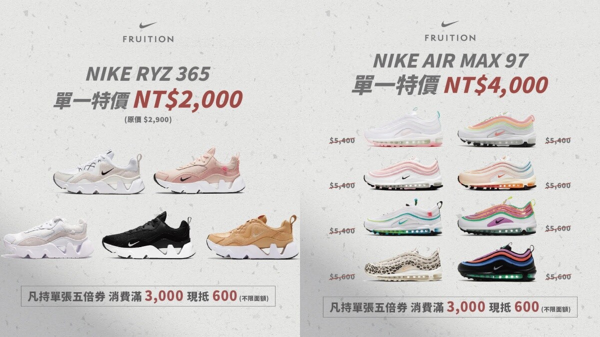 台北東區人氣球鞋選貨店Fruition,即日起到11月7日祭出五倍卷加碼活動,只要持五倍卷前往消費,購物買滿3000元現抵600元,此外,Fruition還加碼推出孫芸芸捧紅的Nike RYZ 365球鞋特價一雙2000元,Nike Air Force 1 Shadow球鞋下殺至3000元,人氣鞋款Nike Air Max 97一口氣補足8款配色。