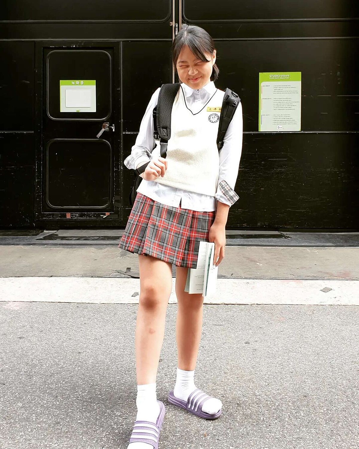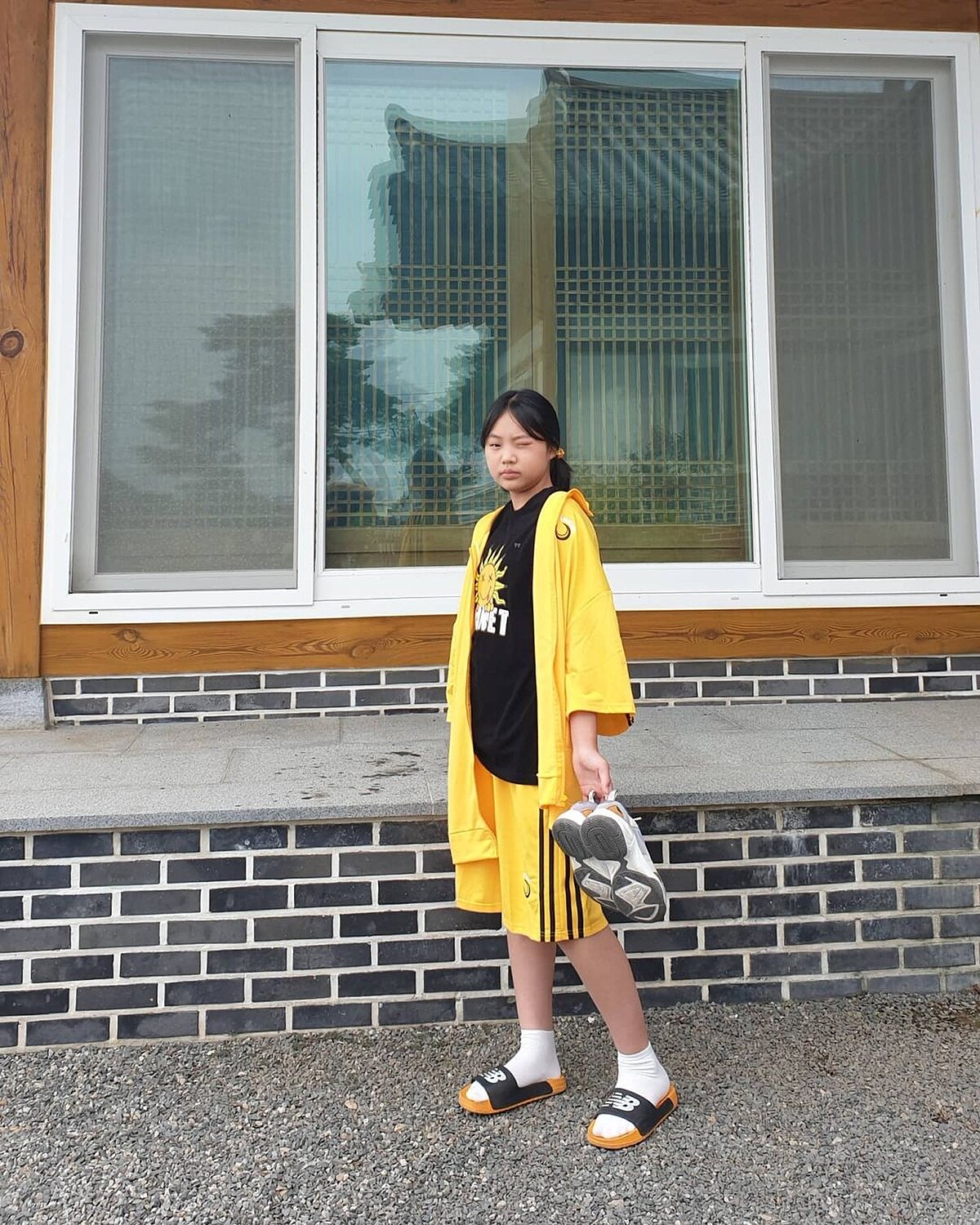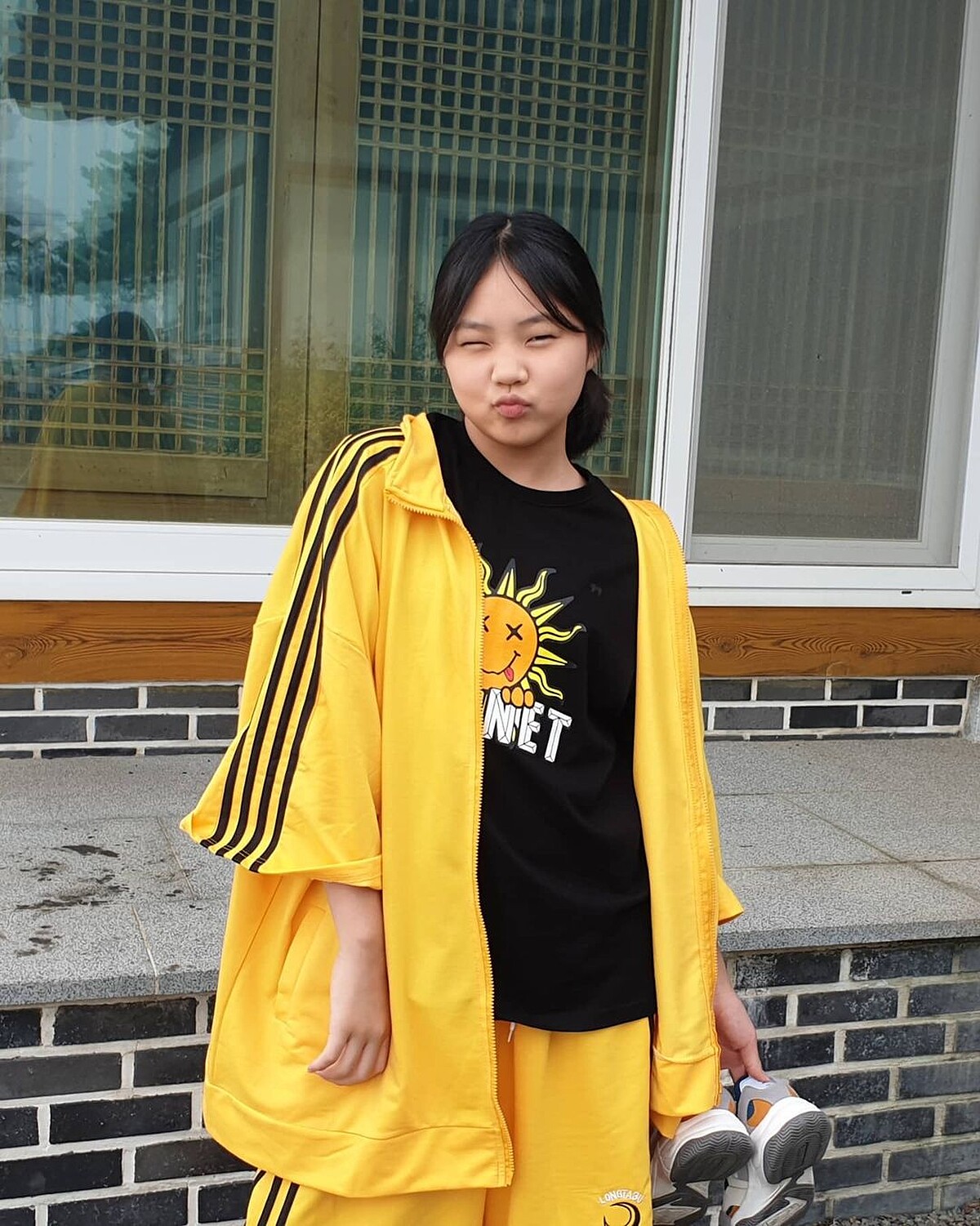 在劇中演出學生吳朱里的金敏瑞,大部分時間都是以中學制服登場,也很常穿著寬鬆T-Shirt配短褲,展現青春女孩的活潑與俏麗,讓人印象深刻的還有這套全身亮黃色的運動裝束。
